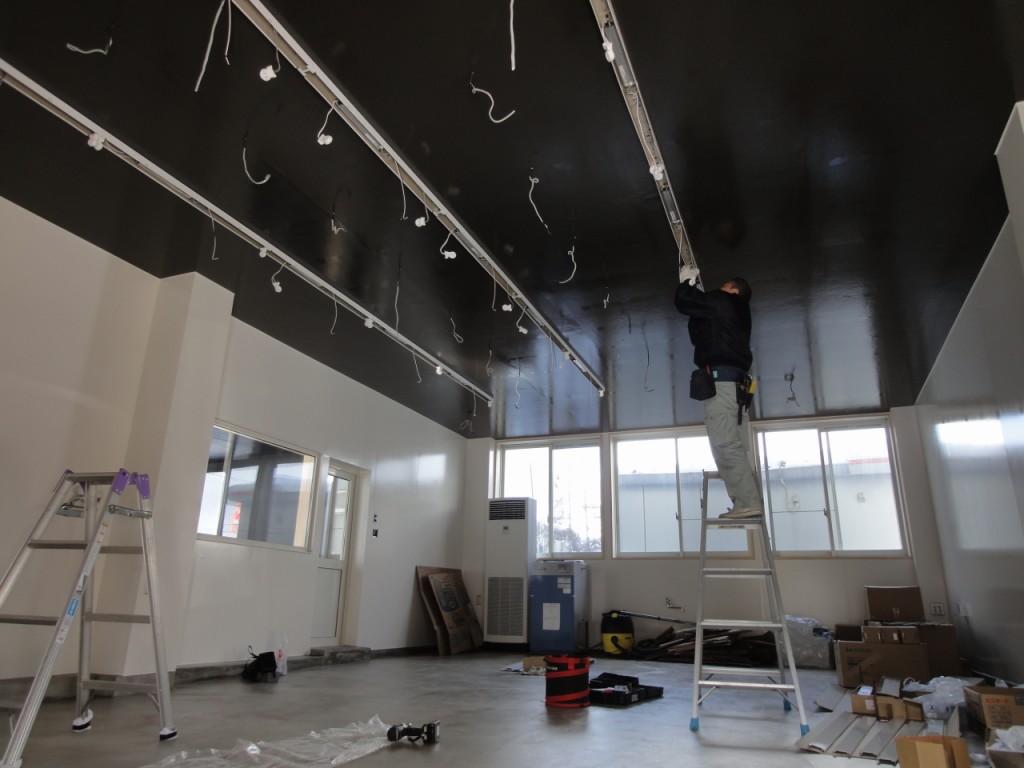 その後作業場では、いよいよ照明器具の取り付けが始まりました!天井が塗装仕上げで、目地がないので、位置決めが大変との事。今日一日作業してくださいましたが終わらずに、明日も作業が続きます。電気屋さん、ご難儀おかけしています。ありがとうございます!