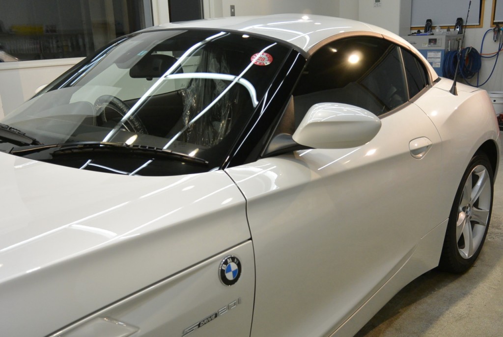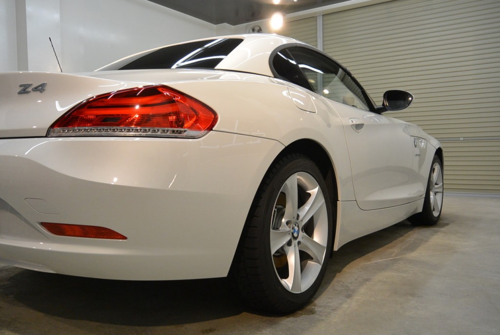 こちらは昨日まで作業し仕上がったBMW Z4です。3年経過の中古車をご購入され、ガソリンスタンドでコーティングをしたものの、全然変化が無く、「コーティングってこんなものなのか?」と思いながら、ご来店くださいました。お手ごろ価格のビューティフルコートと、しっかり研磨のグロスアーマー、どちらにするか大変お悩みになっていました。何しろ、ビューティフルコートなら15,300円(税抜)なのに、スタンダード研磨+グロスアーマーですと175,000円(税抜)と10倍以上違いますから。お悩みになるのもごもっともです。