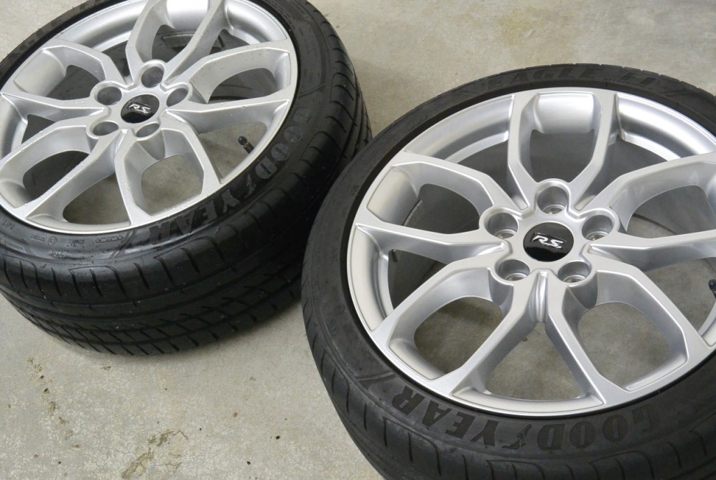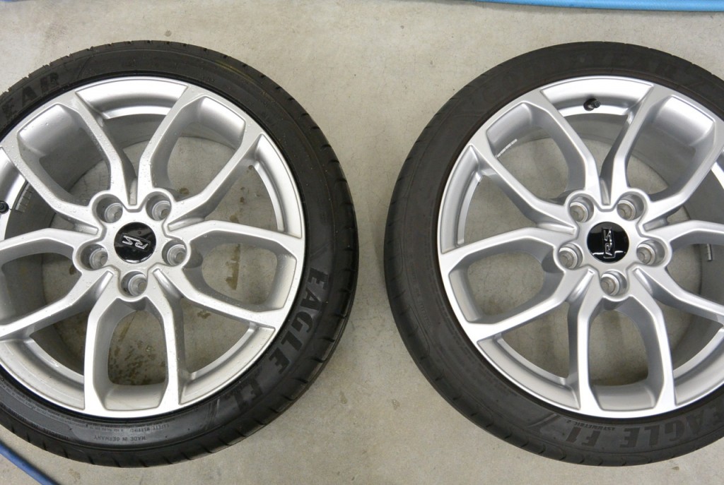 右が当店のルーテシア号のホイールです。ホイールだけ見ると、右のほうが綺麗です。ホイールコーティングしてありますので、新品よりピカピカしてます。左の新品は、タイヤワックスが塗られていました。ギトギトして、実はタイヤにも良くないんです。後で洗い流します。右の当店のタイヤはワックスは使いません。コロイド洗浄剤で洗っているだけです。ホイールも、汚れやすい外車ですが、コーティングと正しい洗浄の効果で、この美しさを保っています。