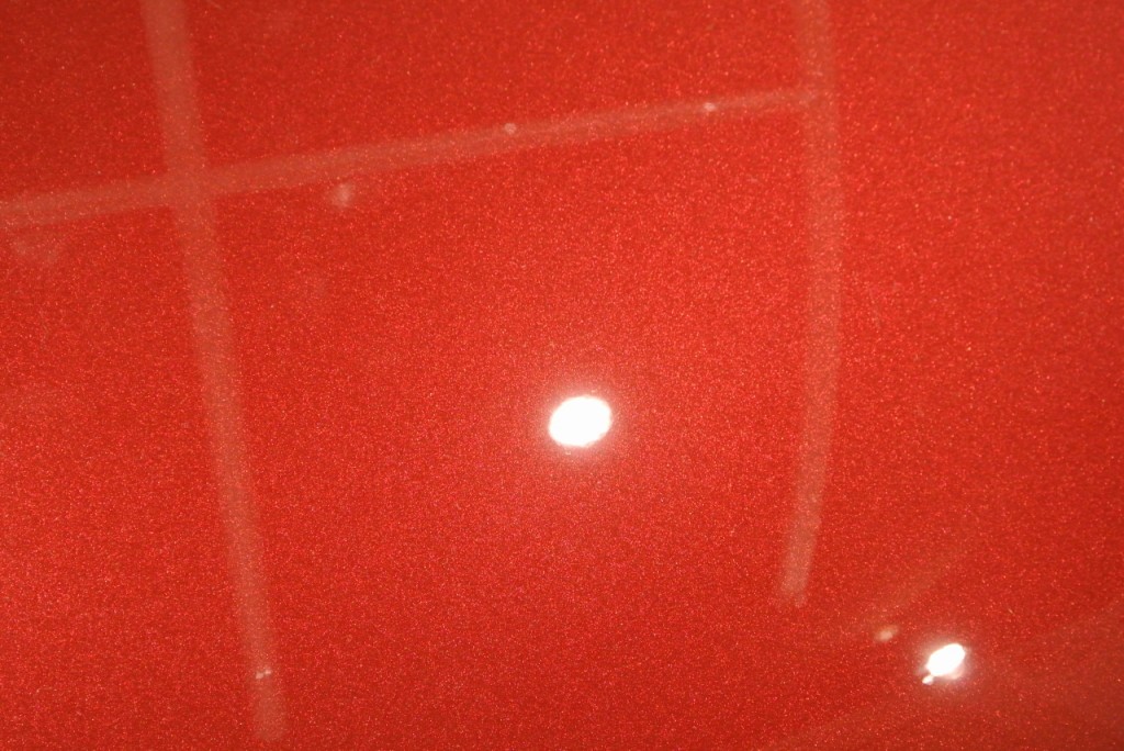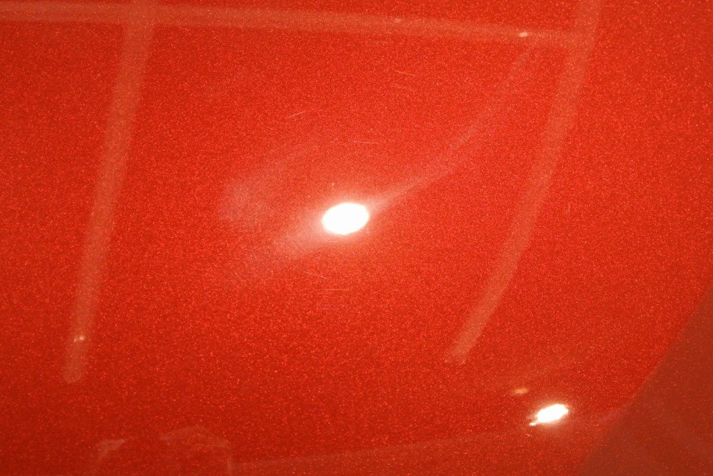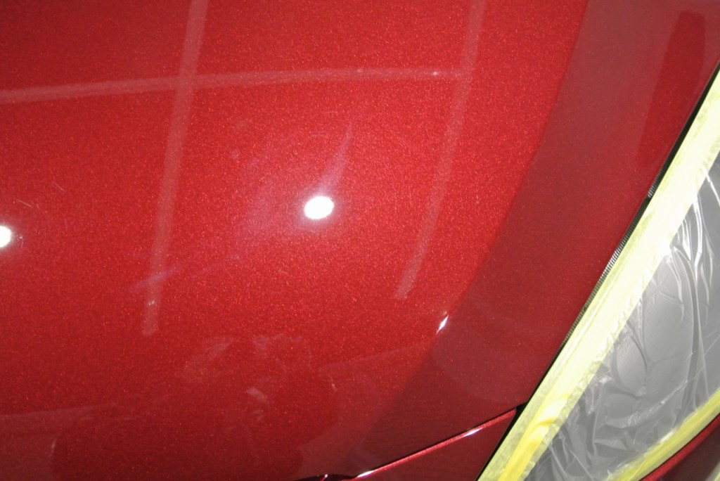 ボンネットにあった、おそらく新車時の修正で磨かれた時の磨き傷。照明の所にもやっと見えているのがおわかりになるでしょうか?普通にポリッシャーで磨くと、この様にバフ目と呼ばれる、コンパウンドの磨きあとをつけてしまうのです。