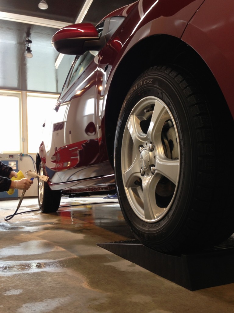 コーティングに入る前に、しっかりと洗車。塗装面の残留コンパウンドを除去し、コーティングが密着するようにします。細部に入ったコンパウンドの粉なども同時に除去。その後はまたしっかりと水切り。コーティングは水を嫌います。洗車、水切り、洗車水切りと手間がかかりますが、良いコーティングをする為には必要な事です。前輪を少し持ち上げて、サイドシル下部もしっかりと水切り。