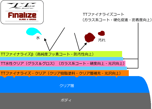 今回のご用命は5層構造のTTクリアファイナライズ。クリア樹脂塗料を塗装面に塗り込み削った塗料を補充。研磨で仕上げた艶がさらに上がります。それをTTファイナライズコートやTT水性クリア、高純度フッ素コートのTTファイナライズβなどでしっかりと固め、保護していきます。