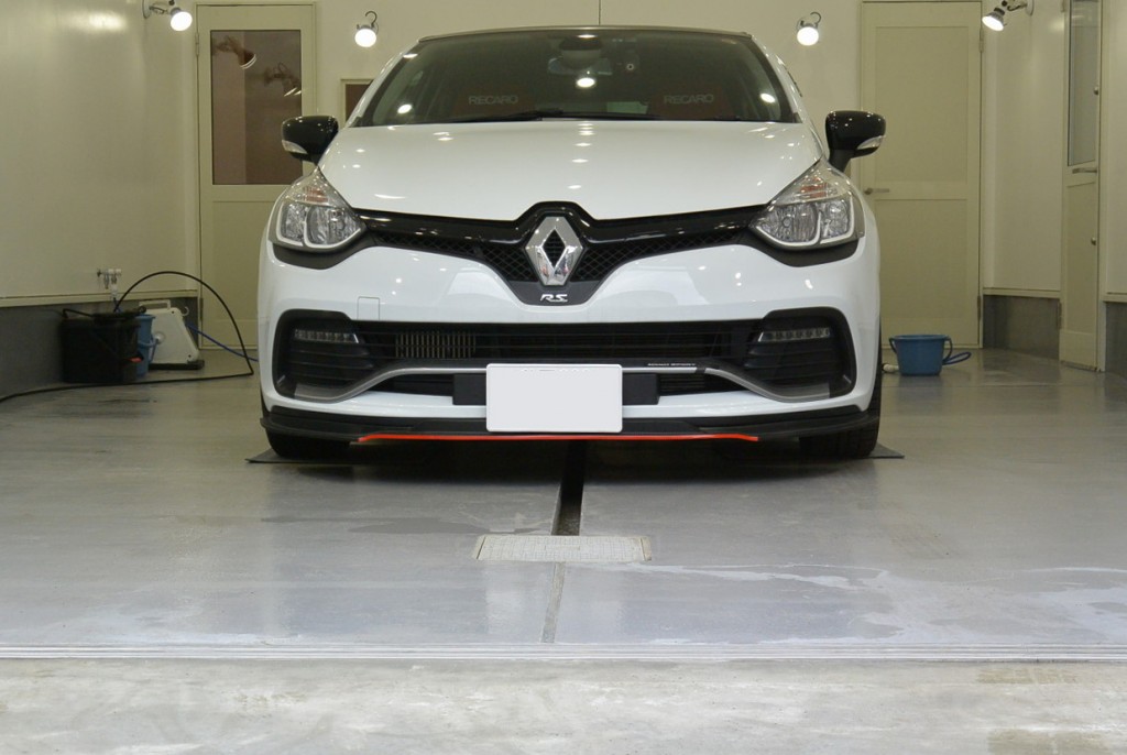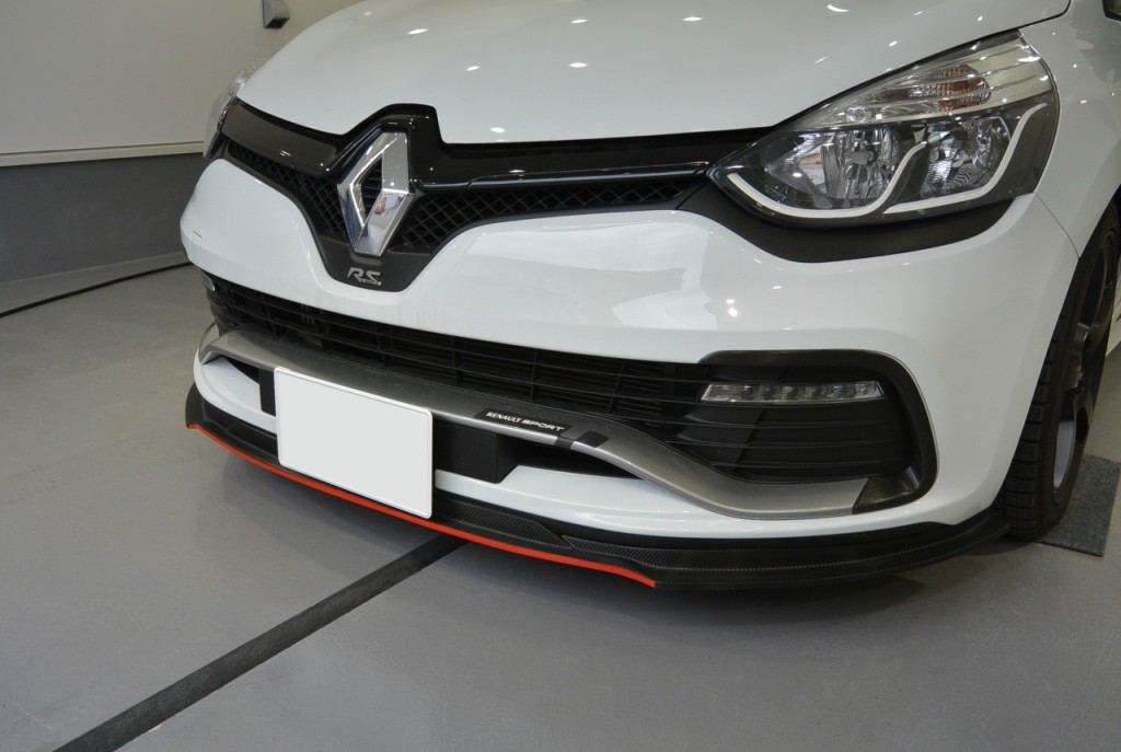 こちらのルーテシアのフロントスポイラー。もともと艶消しブラック塗装のFRP製なのですが、それを「ラッピング」で、カーボン調と、一部に赤のラインを入れさせていただきました。(写真が洗車前で、オーナー様、大変申し訳ございません)