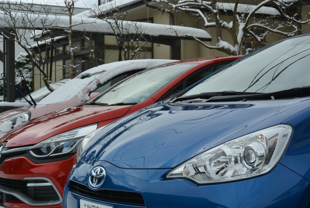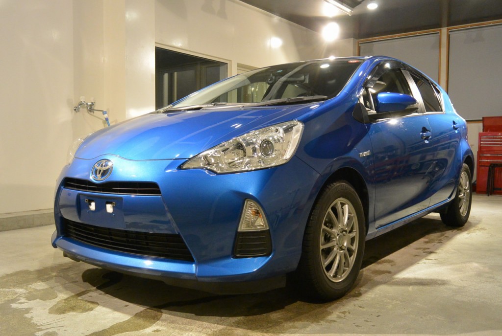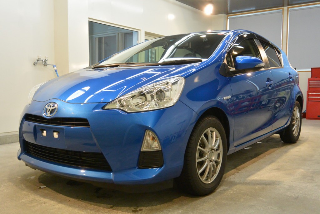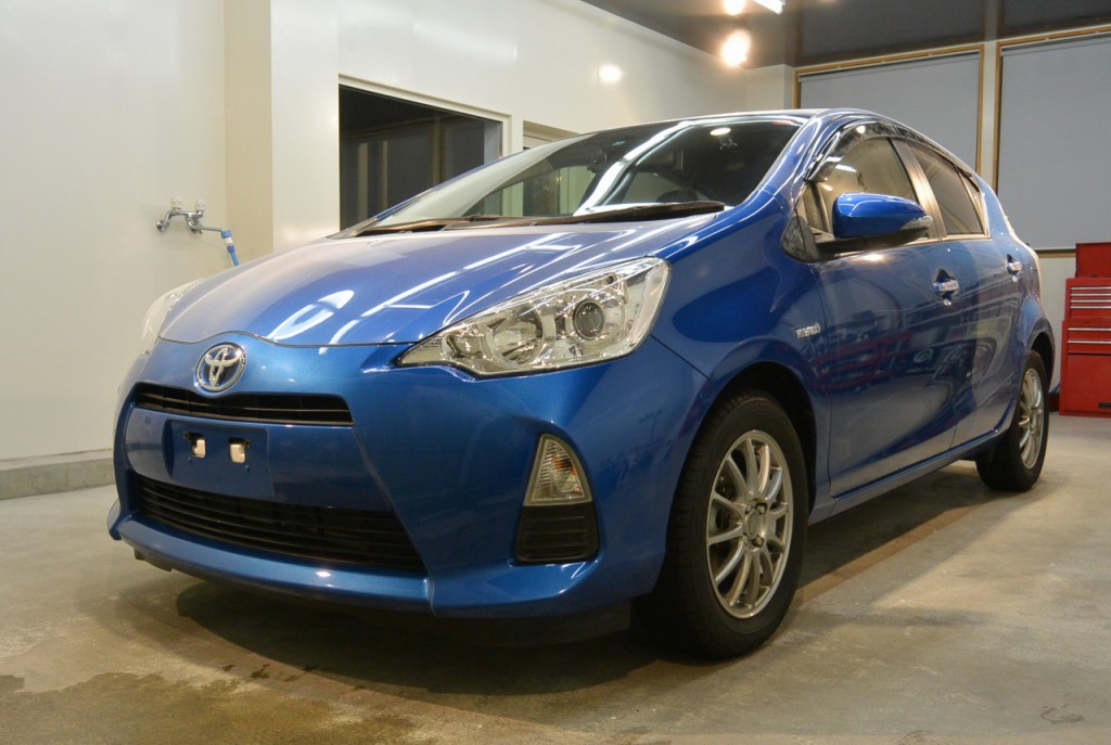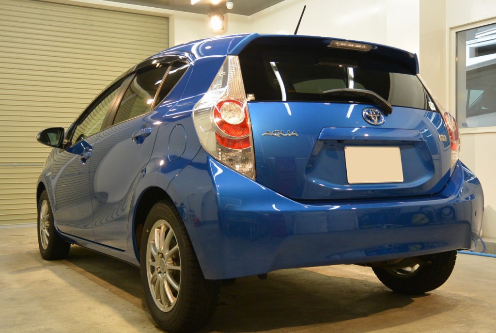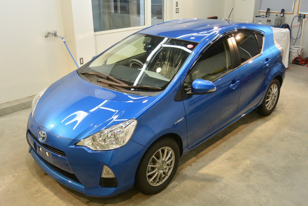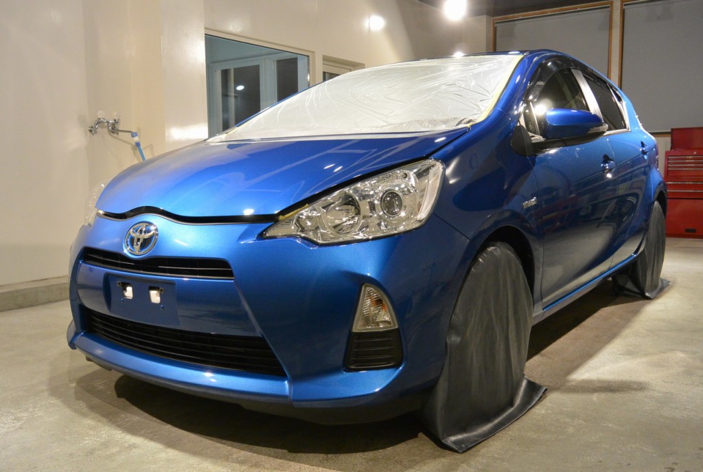 トヨタ アクア、フロントバンパー修理+スタンダード研磨+コーティング(グロスアーマー)のご用命でご入庫いただきました。