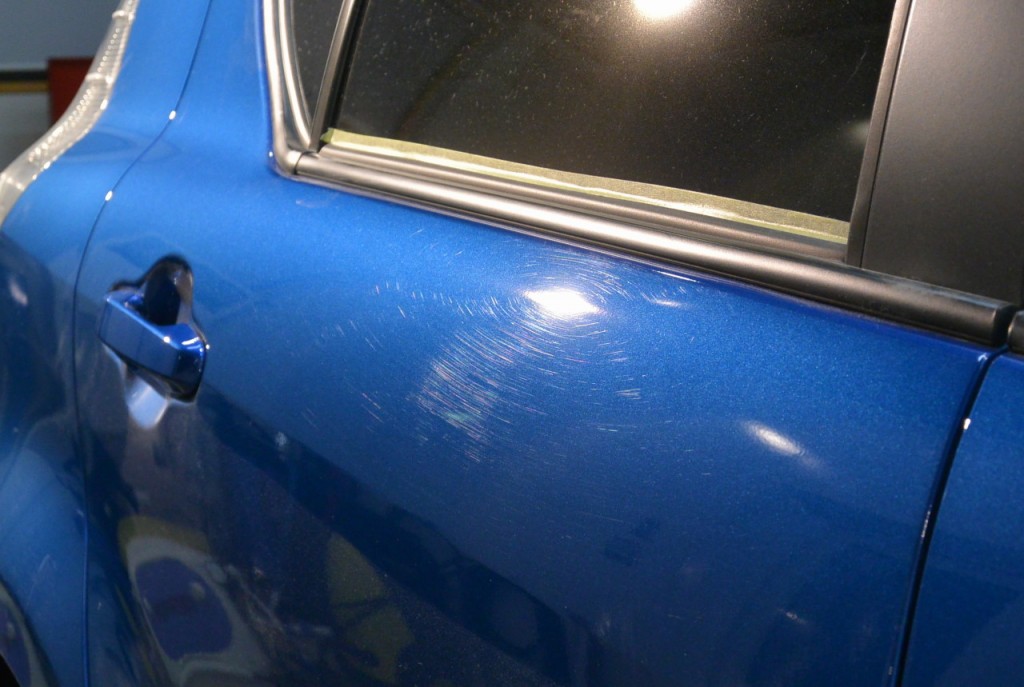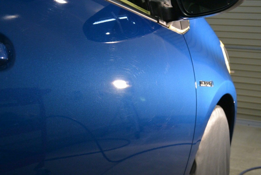 この度、スーパーの駐車場で他のお車にぶつけられてしまったとのことで、お相手の保険を使っての修理と、この機会にさらに綺麗にしたいとのことで、追加でスタンダード研磨をしてのグロスアーマーのご用命をいただきました。