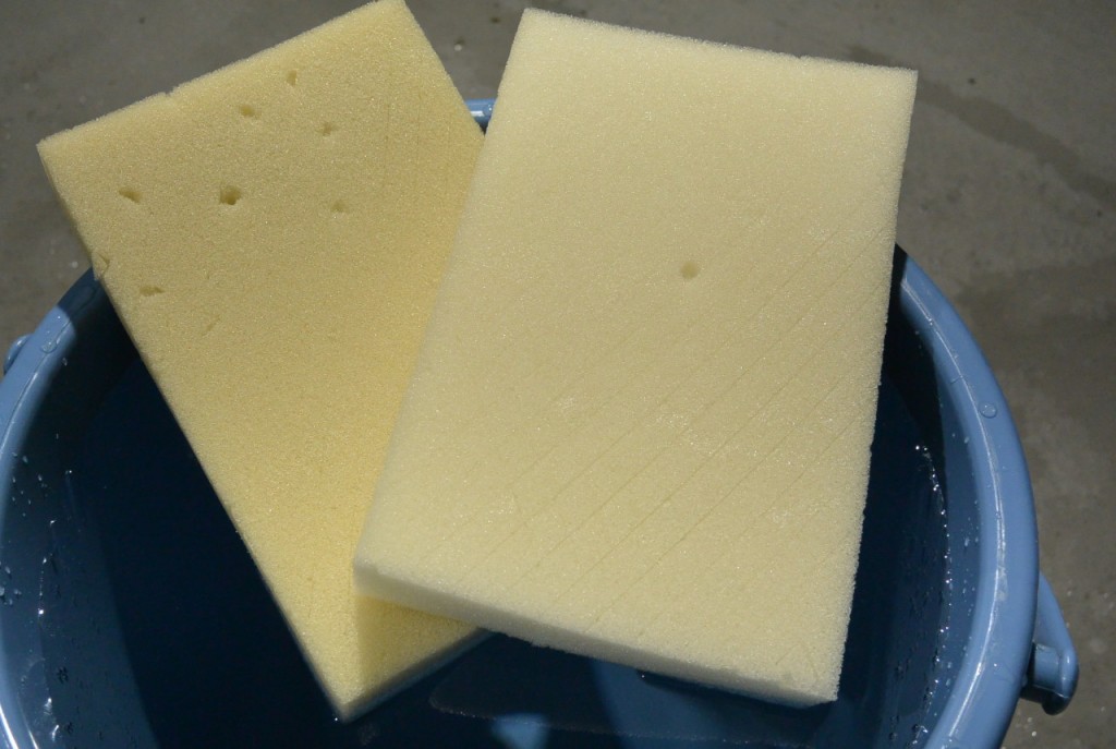 写真は本日使用した洗車スポンジです。洗車傷の一番の原因は、砂や泥の粒を引きずってしまうことです。洗車中も勿論ですが、1台洗うごとに、一粒の砂も残さないようにスポンジを洗います。所々スポンジが欠けているのは、中に入った砂粒を取り出した跡です。スポンジが白いのは、砂粒を見つけやすいからです。