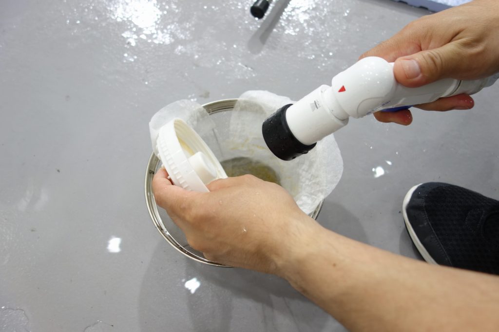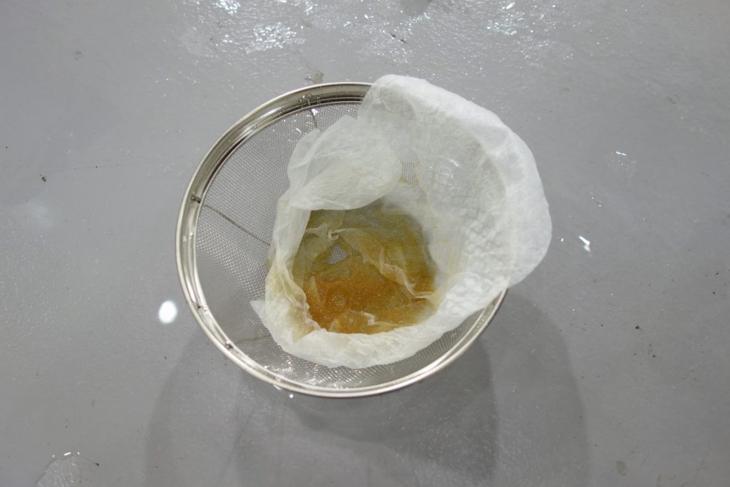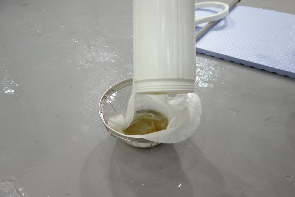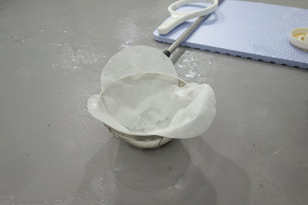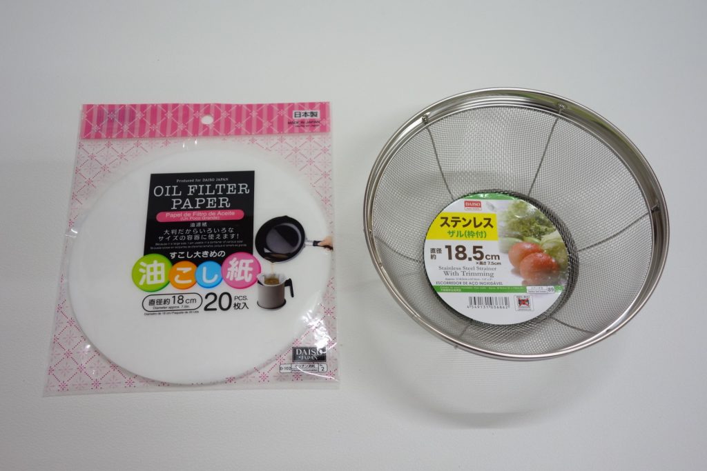イオン交換樹脂を下水に流してしまわないよう、今回は100円ショップでザルと油こし紙を用意しました。
