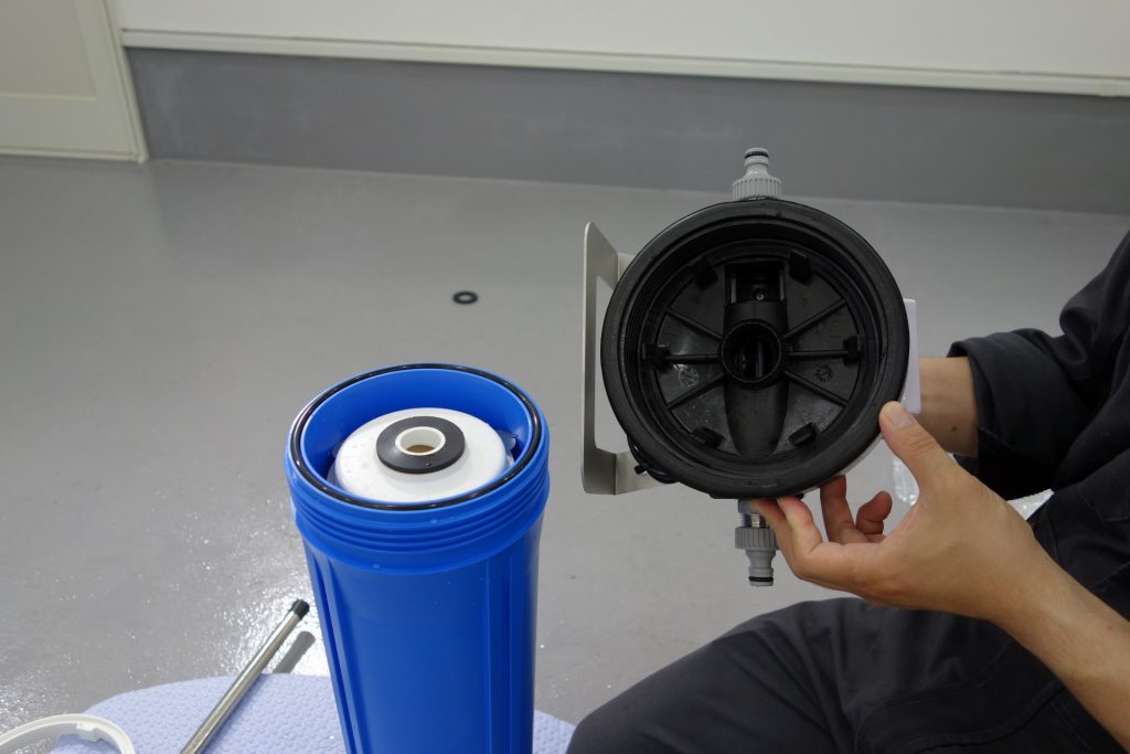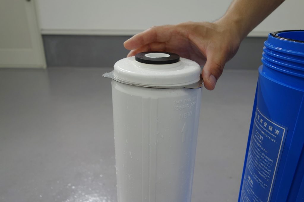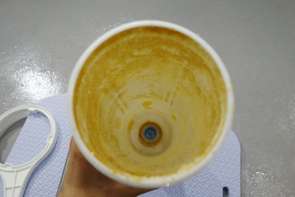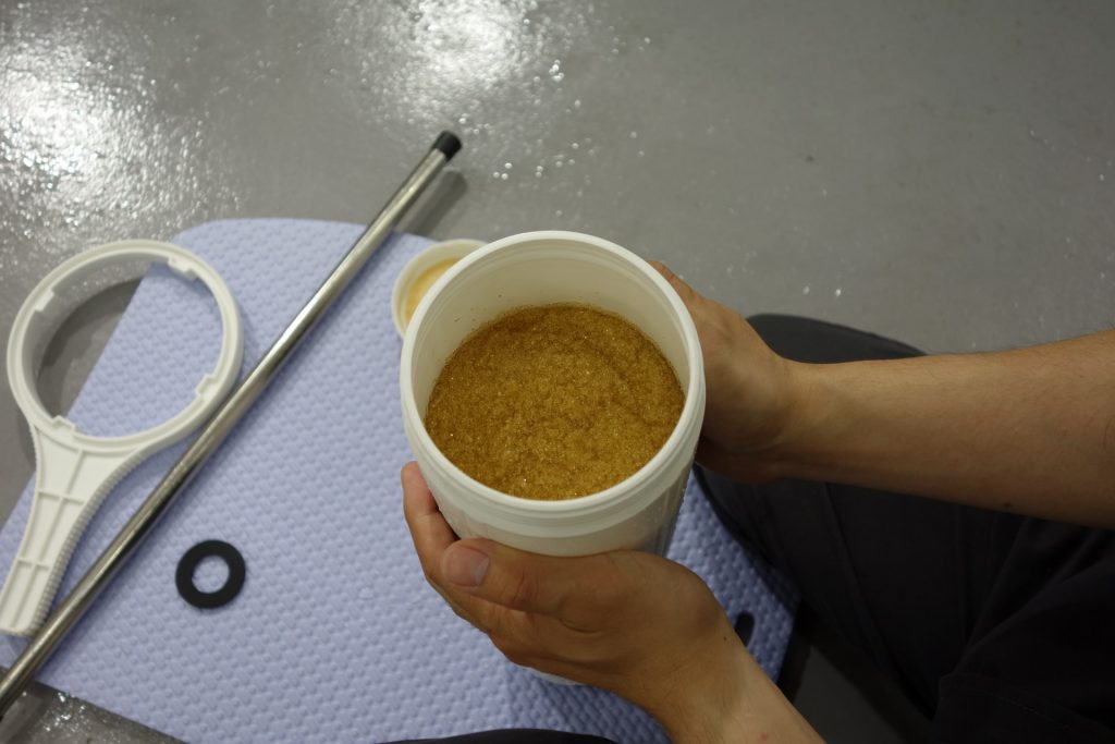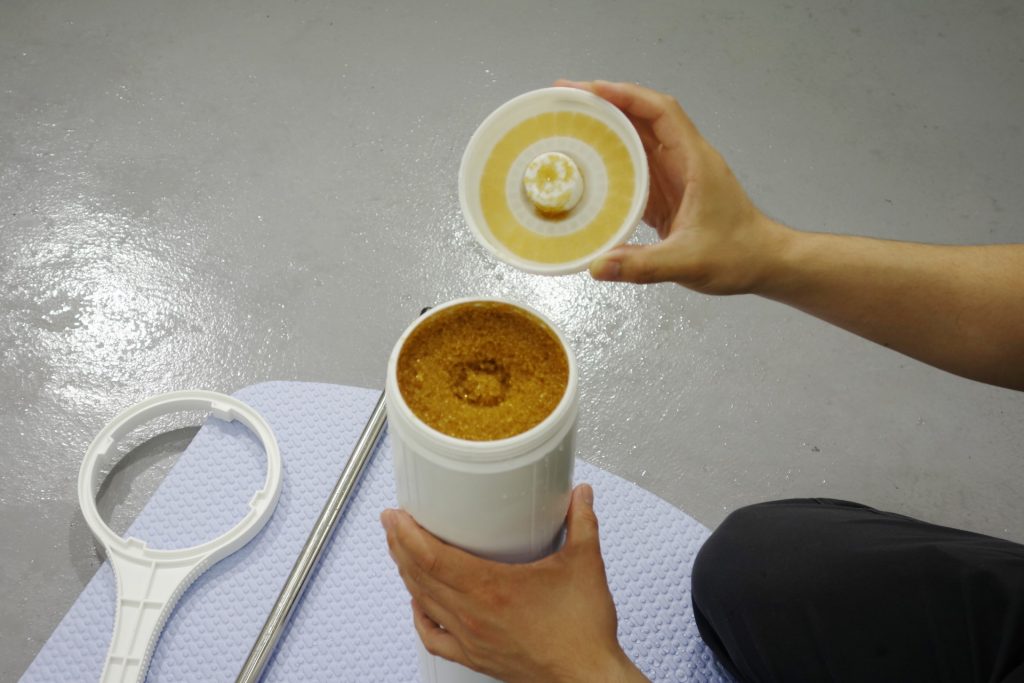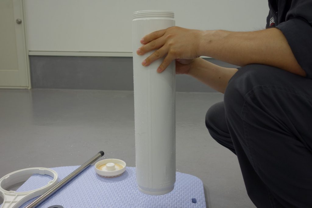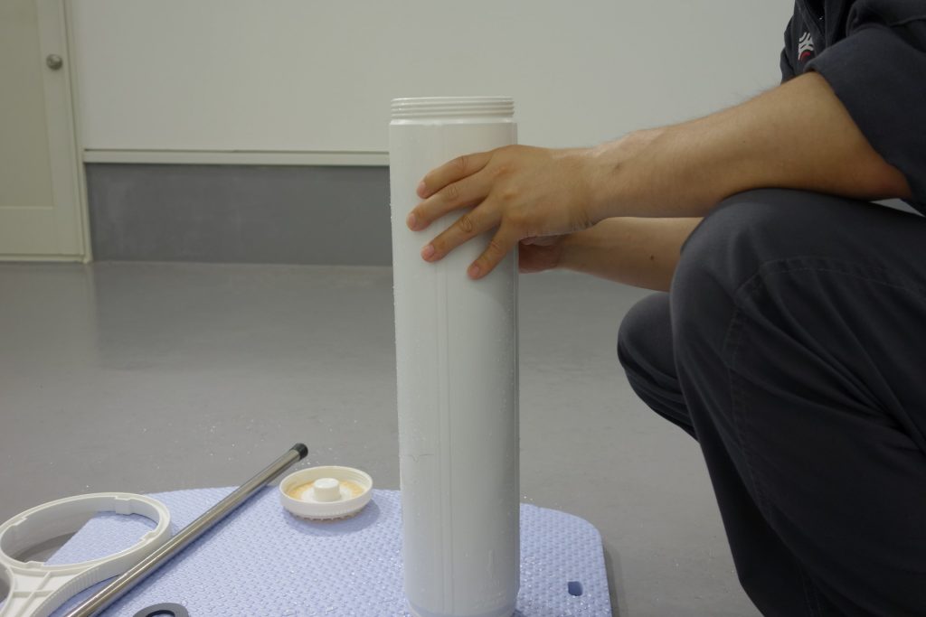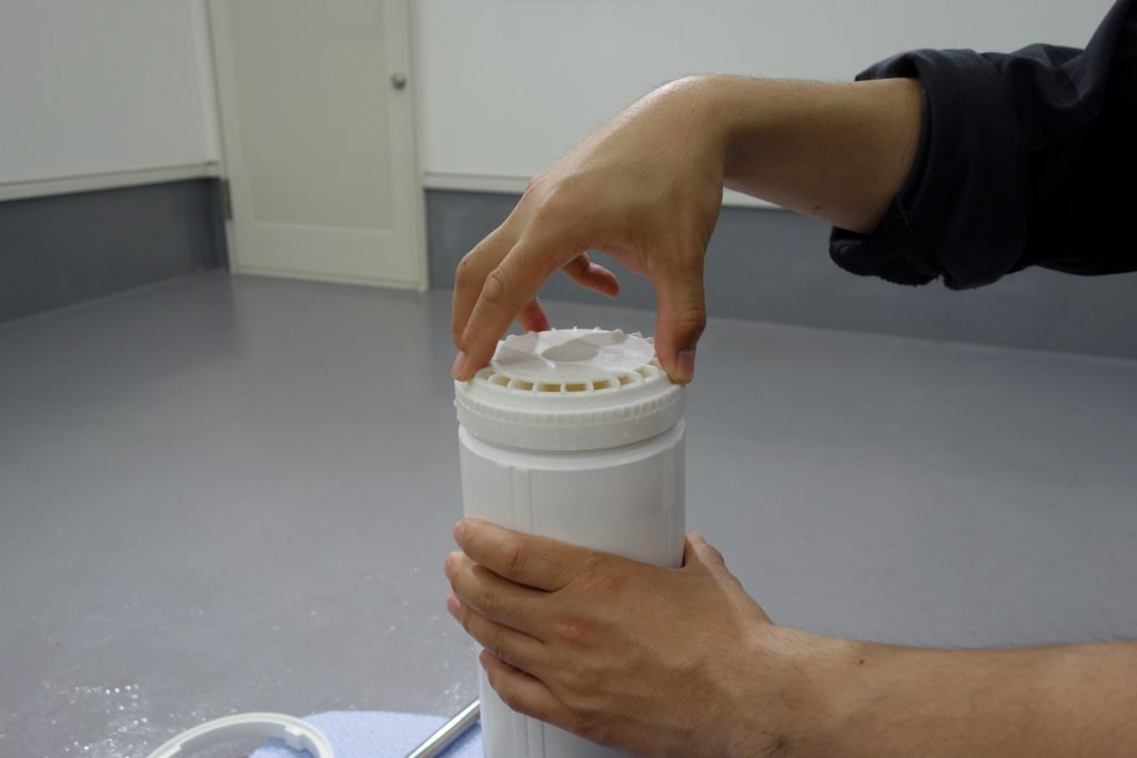 ハウジングを取り出したら、中のイオン交換樹脂を取り出す作業に入ります。カートリッジを逆さまにし、蓋を開けます。