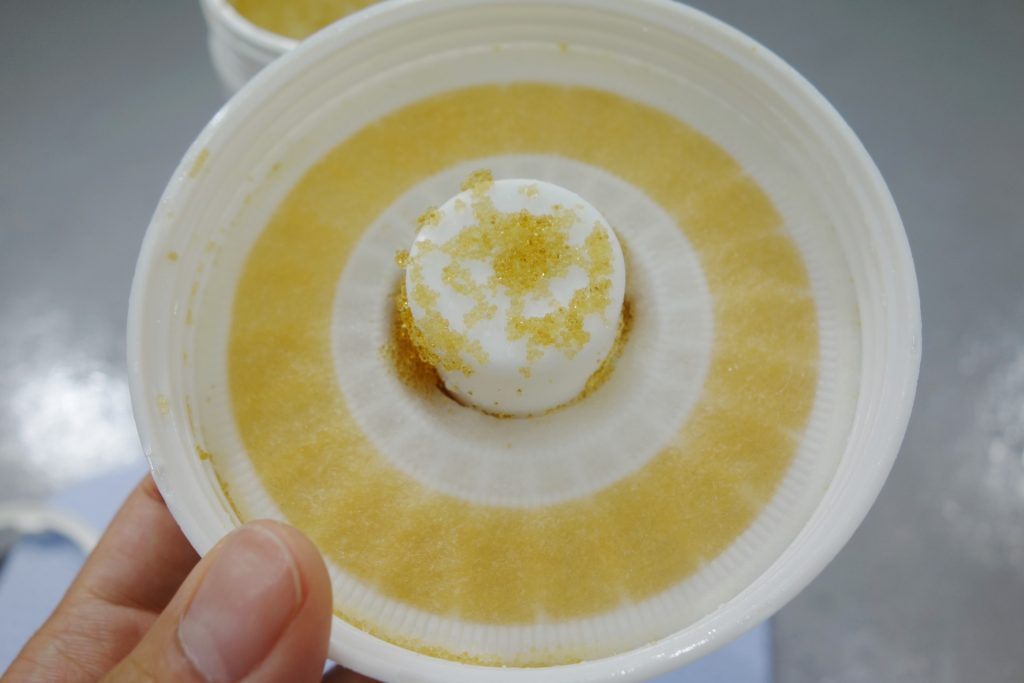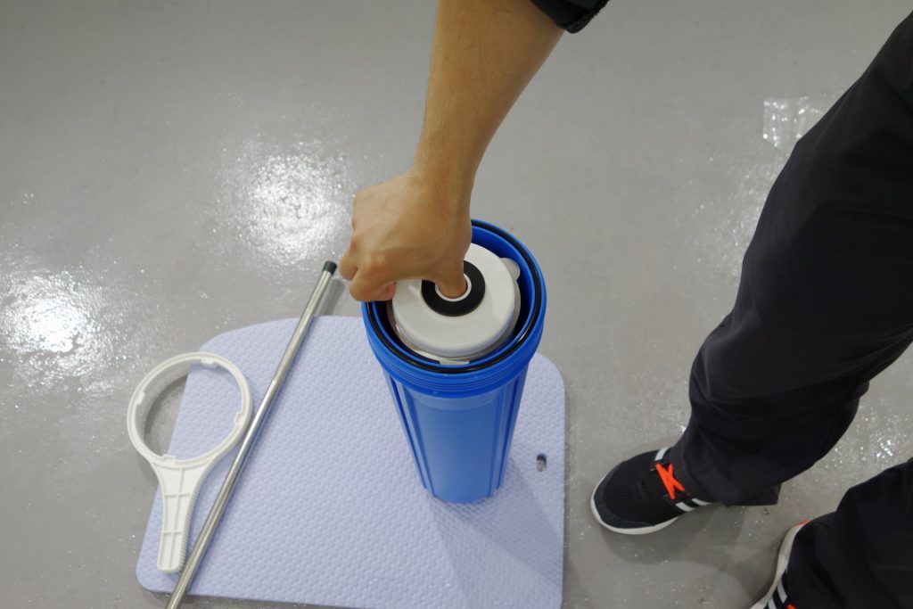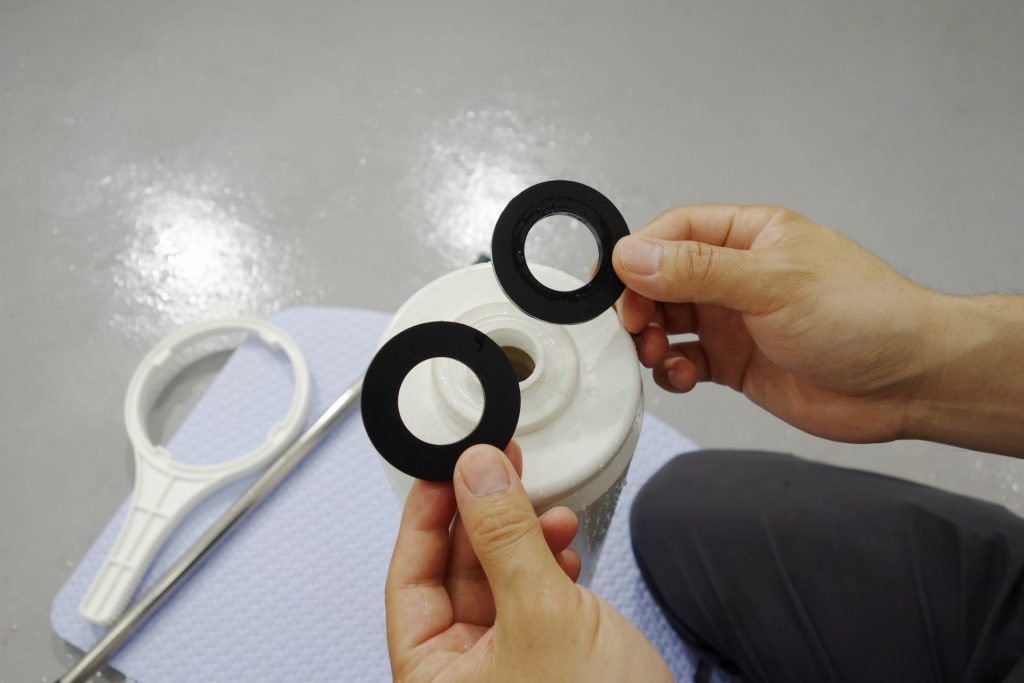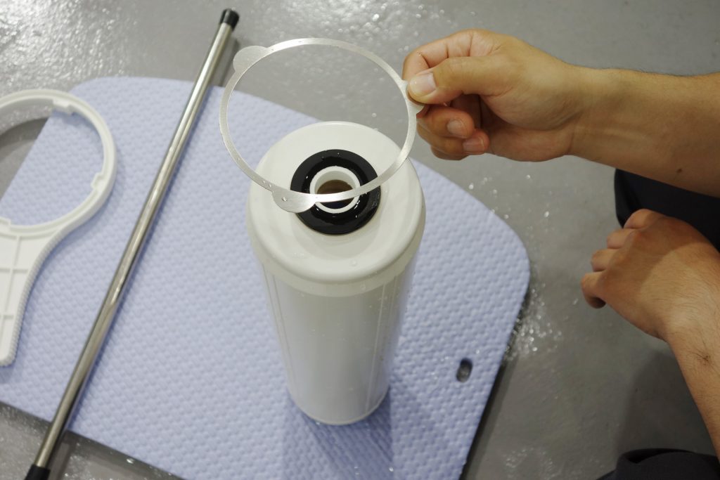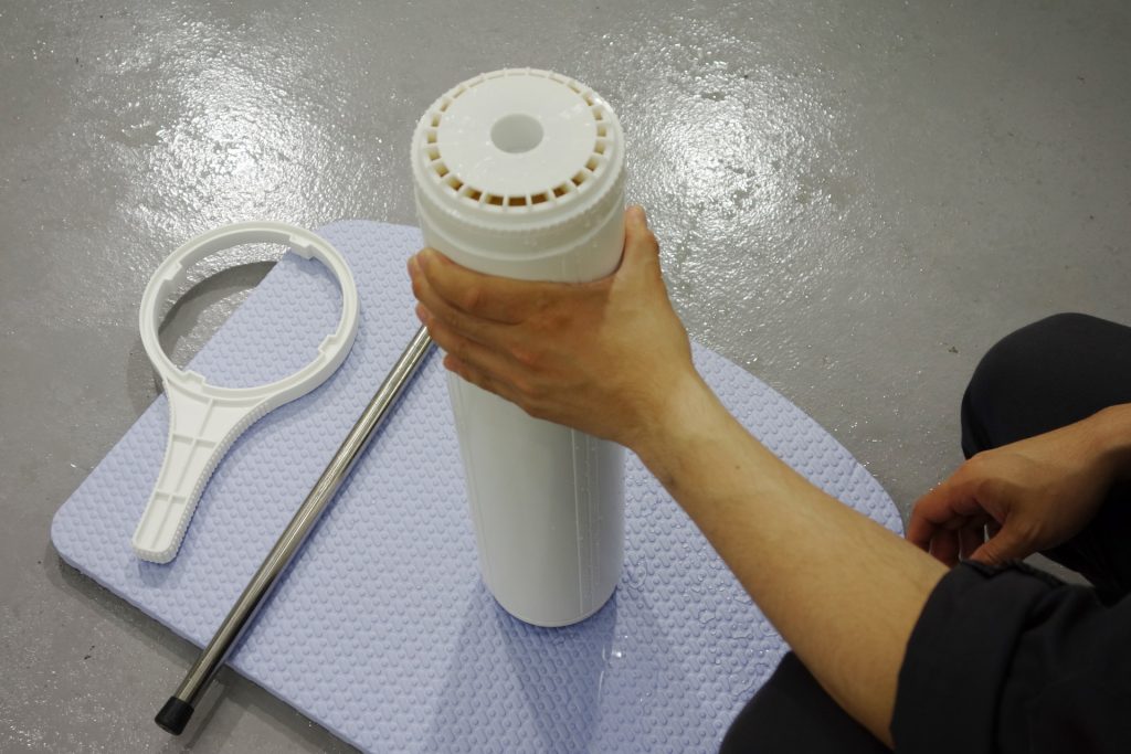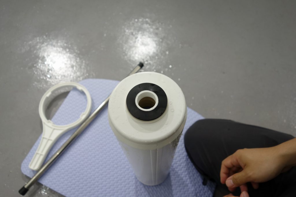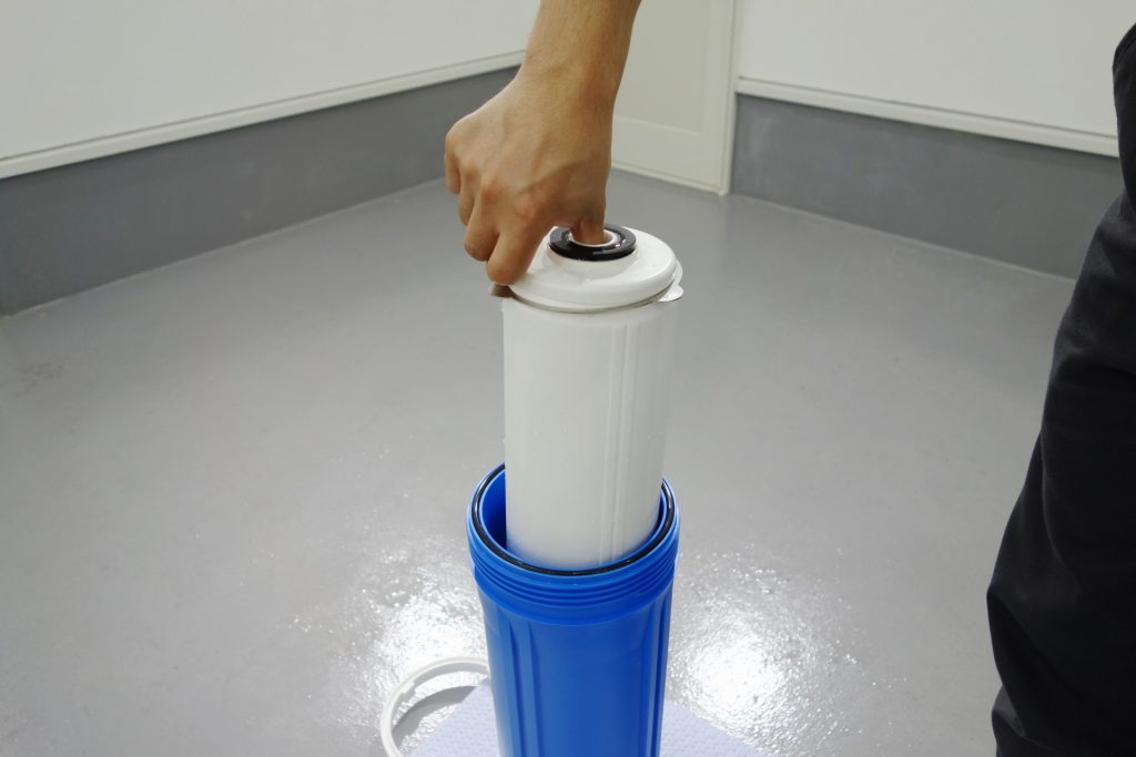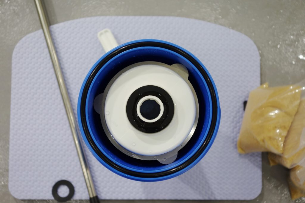 ハウジングを取り出したら、中のイオン交換樹脂を取り出す作業に入ります。カートリッジを逆さまにし、蓋を開けます。