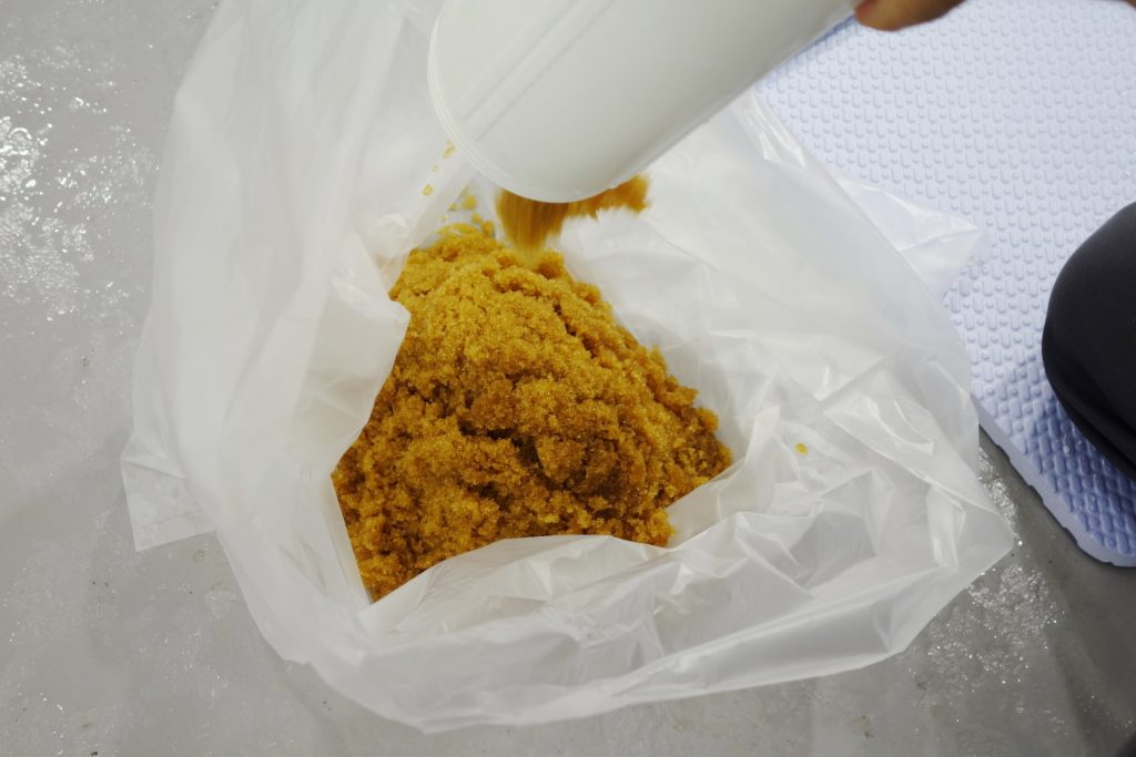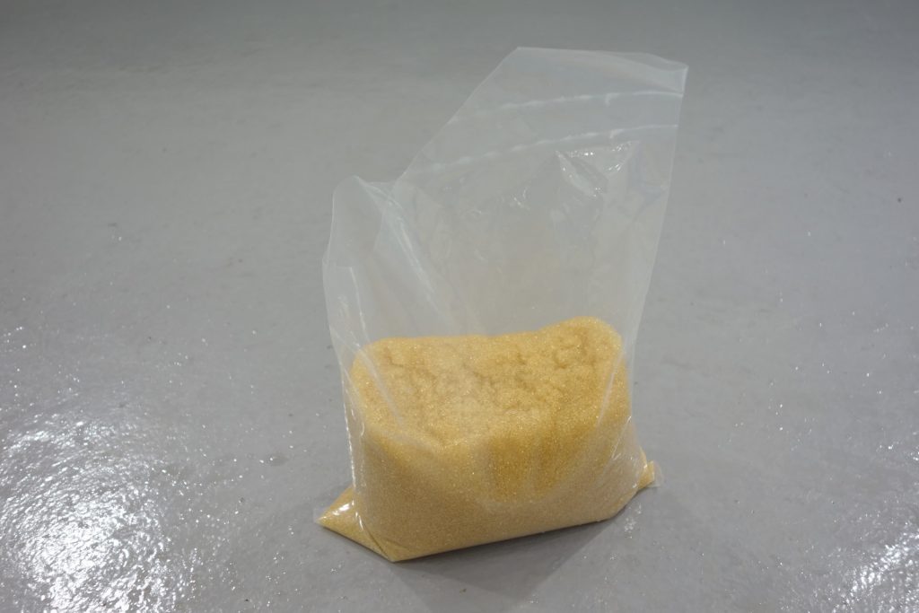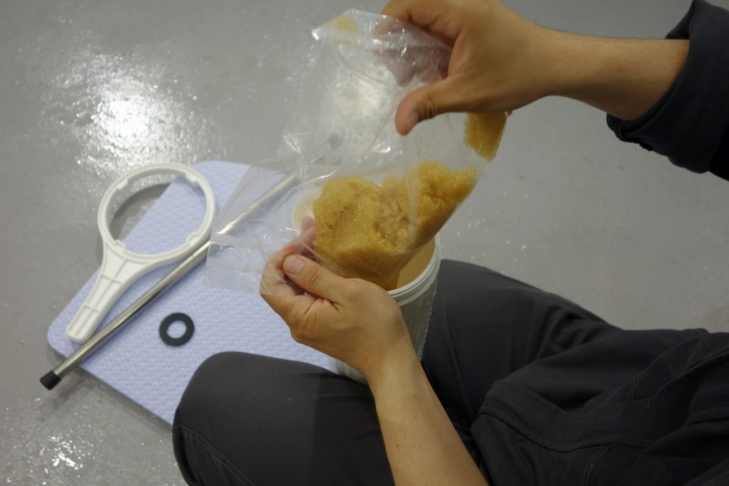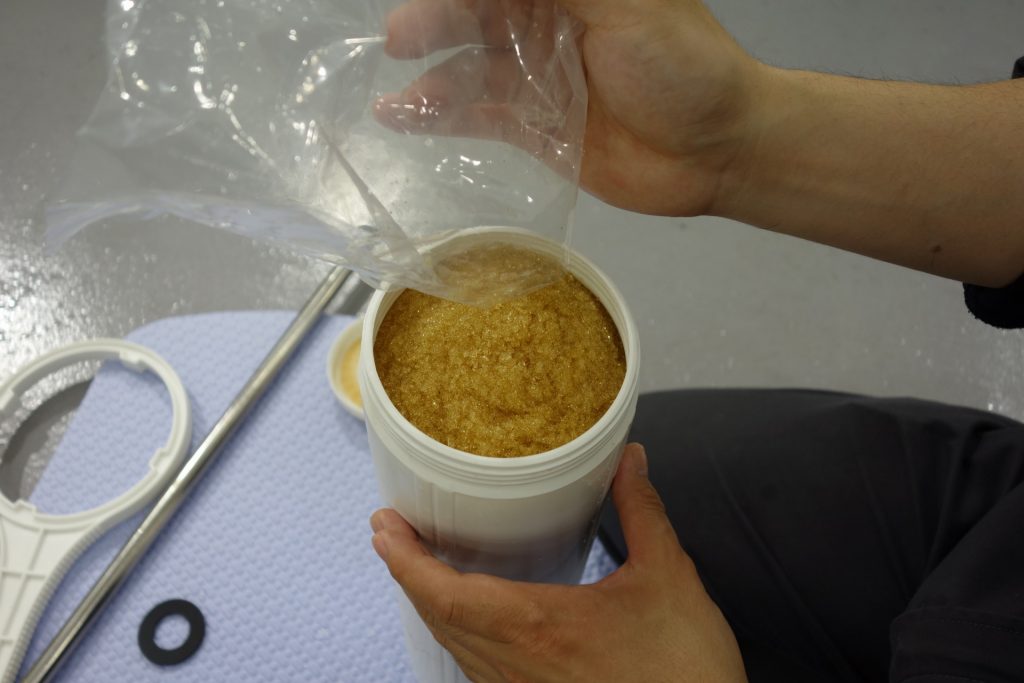 続いてイオン交換樹脂の充填作業です。2本で9袋使用しますので、1本当たり4袋半入れます。