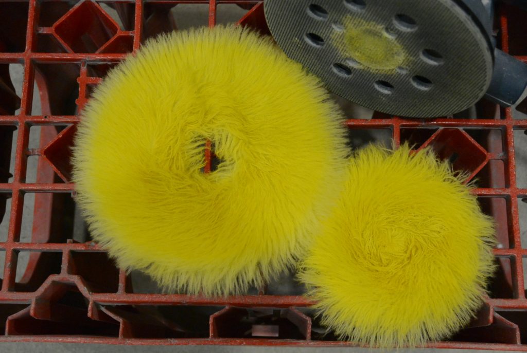 通常、塗装の表面は、透明な「クリア塗装」がされているのですが、ビートはそれがありません。ですので、研磨すると、黄色の塗装が削られるので、使用したバフは、このように黄色く染まります。ひまわりみたいですね!ビタミンカラーで、見てると元気が湧いてきます(^^)