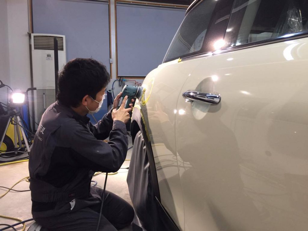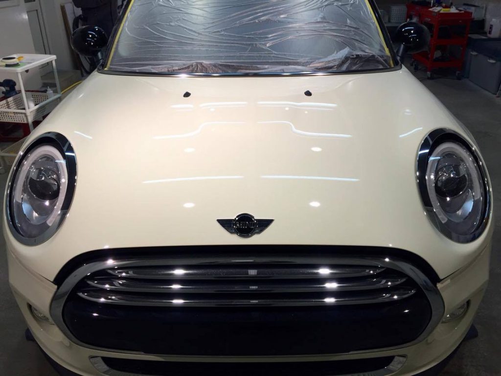 コーティングブースでは、MINIの研磨作業が進んでおります。