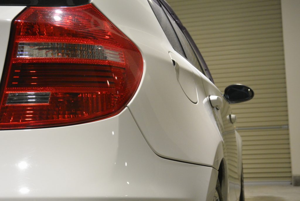 コーティングブースでは、BMW130i M-Sportのスタンダード研磨+グロスアーマー+全面ガラス撥水コーティングの施工を進めております。徹底的な洗浄で隅々まで汚れを落とした後、現在研磨作業を進めております。まだ研磨していない、テールレンズやバンパーに映り込んだスポットライトの周りに細かな洗車傷が沢山見えます。これらを丁寧に研磨し除去していきます。