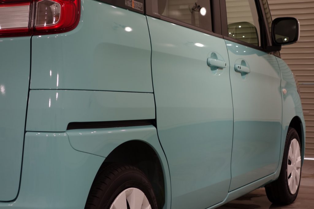 お引渡しの際、お車をご覧になったオーナー様、「さらに綺麗にしてくれてありがとう!!」と仰ってくださいました。水色と白のツートンと、白いホイールカバーが爽やかで、とても素敵なお車でした。また、軽自動車なのに、白いナンバープレートが付けられる、期間限定のラグビーワールドカップ仕様ナンバープレート。実際に見たのは初めてでしたが、全体の色合いともマッチしていて、とても良い感じでした。
