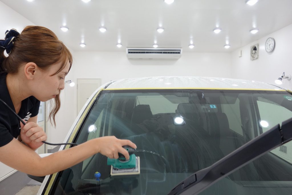 ガラスの撥水コーティングも、ボディー同様、下地づくりが大切です。ガラス表面の汚れや、古いコーティング皮膜をしっかりと除去してから、コーティングを行います。