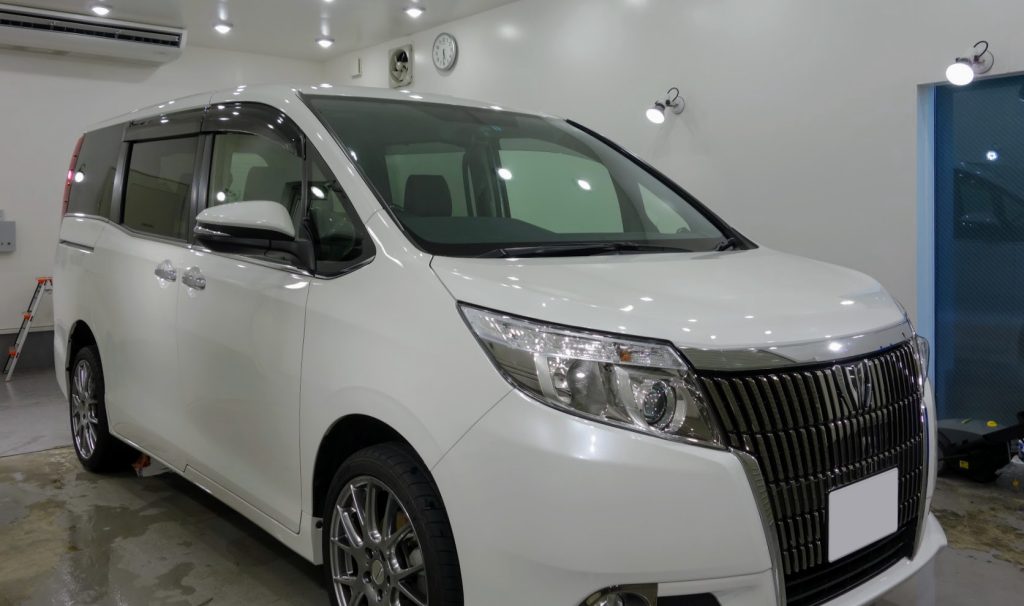 トヨタ エスクァイア。2年前に1年耐久型の旧ビューティフルコート(※旧ビューティフルコートの新規施工は、現在お受付しておりません)を施工いただいておりました。その後もクレンジング洗車などをご用命いただいておりましたが、この度、バージョンアップした極艶ビューティフルコートと、フロントガラス撥水コーティングのご用命でご入庫いただきました。ありがとうございます!