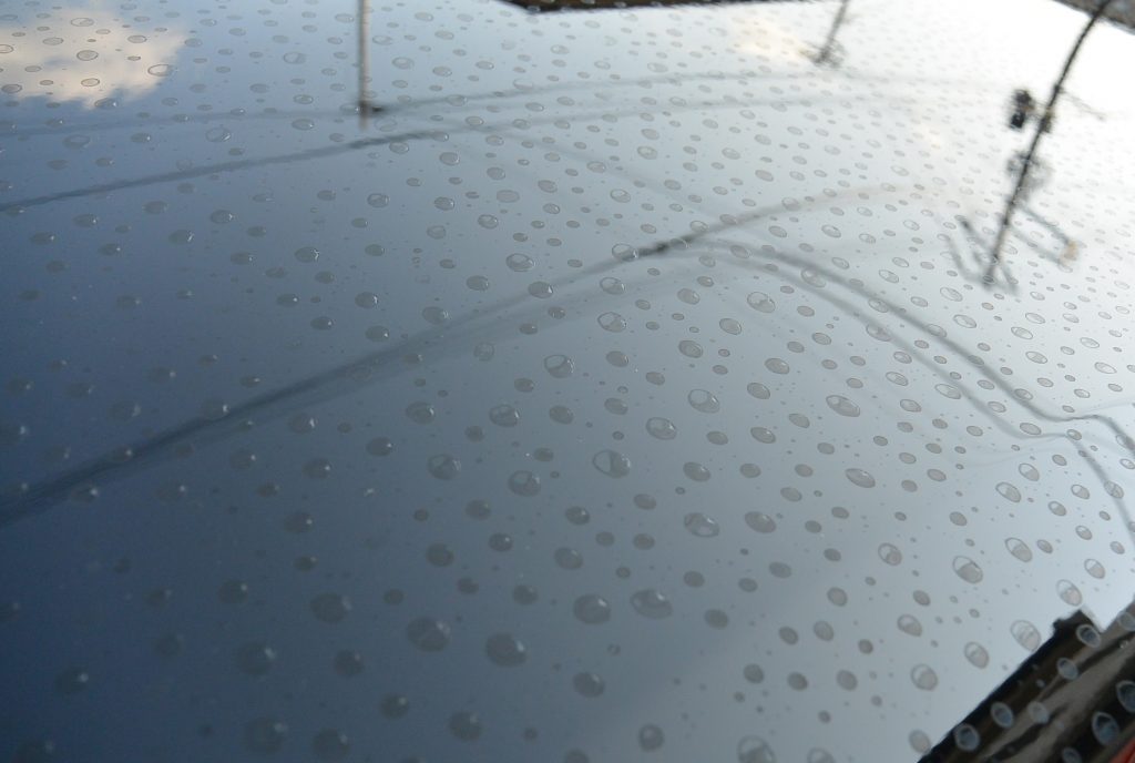 なぜ、雨水のミネラル分が少ないかというと、雨は一度蒸発した水です。つまり蒸留水なんです。水道水と雨水を実際にボンネットに垂らして乾かしてみます。