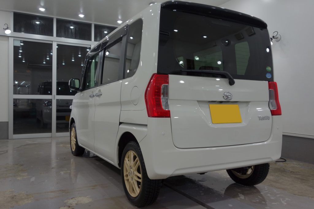 さて、こちらは、セルフ洗車でご来店いただきました、ダイハツ タント。こちらのオーナー様は女性の方です。こんな寒い日なのに、ご自身で優しく洗車されていました。洗車の間隔がちょっと長く開いてしまい、若干汚れが固着して、普通に洗車しても落ちない状態になっていました。「ゴシゴシ擦っちゃいけないんですよね?」とご質問くださり、落とし方をお教えいたしました。
