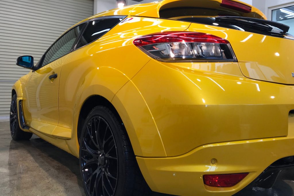 グロスアーマーを施工してから1年以上経過したルノー メガーヌR.S。クレンジング洗車でご入庫くださいました。洗車傷も少なく、このように大変美しい状態を楽しまれております。