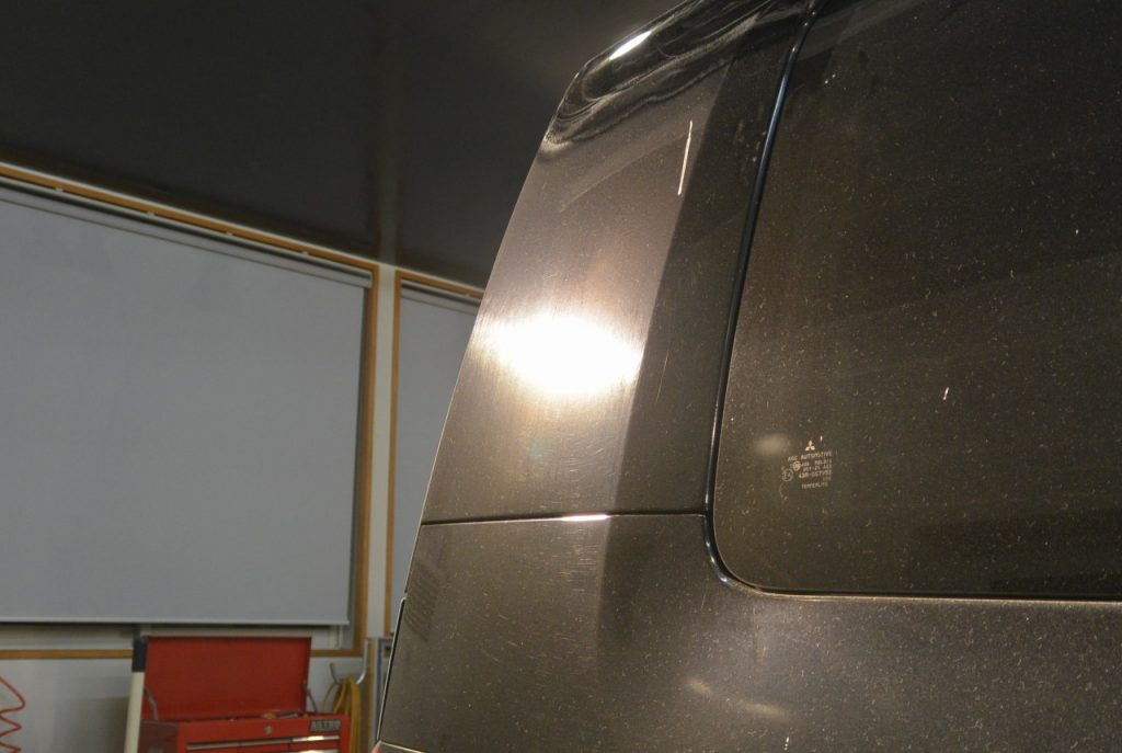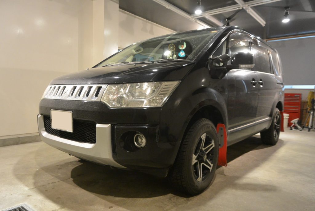 三菱 デリカD:5 軽研磨+グロスアーマーのご用命でご入庫いただきました。新車の時にガラスコーティングをしてから7年、10万キロ以上を走行され、洗車傷やシミなどでお車全体が白っぽくなり、板金塗装した部分だけ黒々として、見た目がおかしいので、何とかならないか。とのことでご相談いただきました。