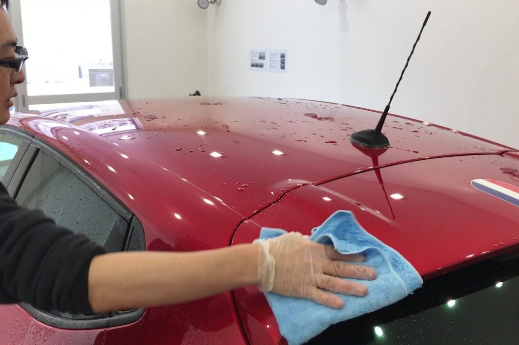 5.マイクロファイバークロスで水を拭き上げる。