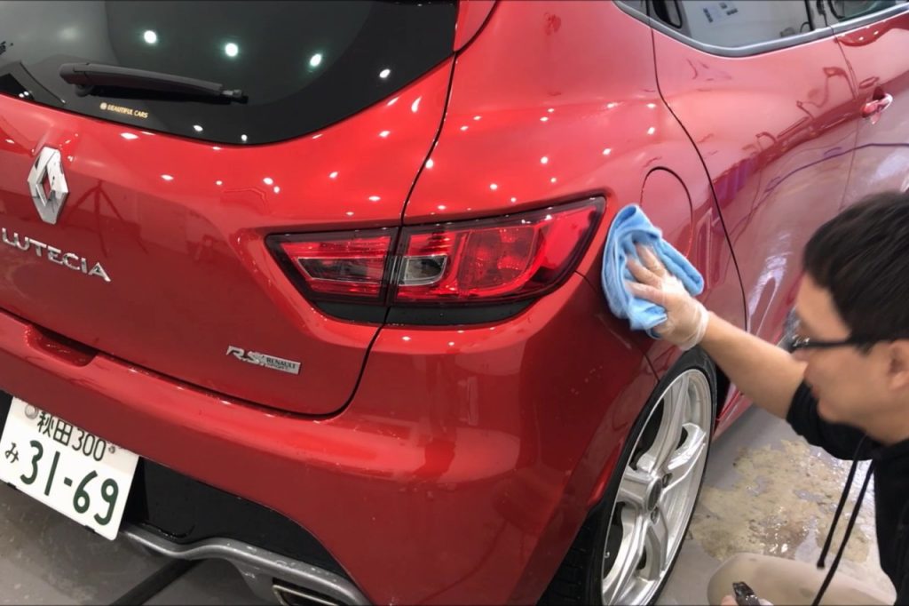 当店のスプレー式コーティング剤、イージーグロスコートナノは、ナノ化に微細化されたガラスコーティングの成分が汚れに浸透し、ベースのコーティングや塗装表面から汚れを浮かせて除去します。とてもクリーニング効果の高いもので、普通のクルマを拭き取っていると、クロスがすごく汚れてきます。ルーテシア号は、ここまで拭いても、このようにクロスは綺麗なまま。洗車の時点で汚れが落ち、塗装面に汚れが殆ど付いていない状態だからです。