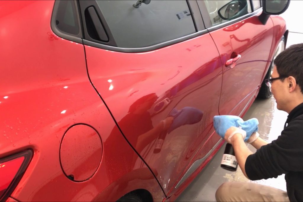 ドア下側はタイヤが巻き上げた水しぶきでミネラル分の付着(水溜りの水は水道水ほどではないですが、ミネラルを含みます)がありますので、スプレー式コーティングをクロスに足してから拭き上げましょう。