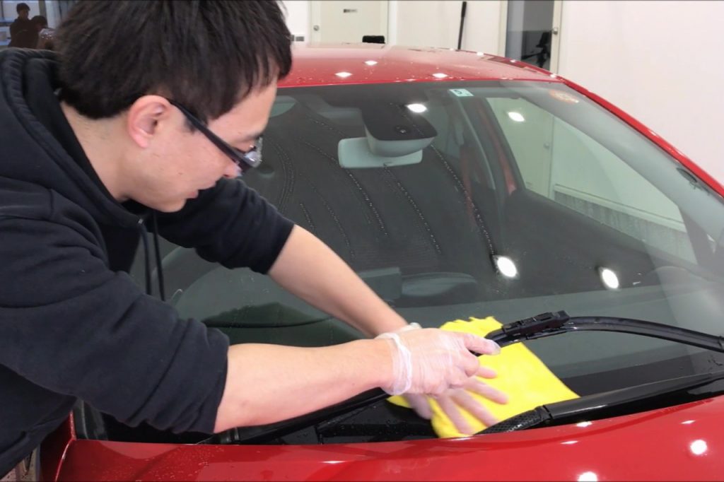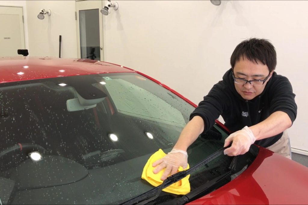 フロントガラスを拭きます。ガラスの撥水コーティングをしている場合、少し強めに拭いて、コーティング面の汚れを擦り取ってあげると良いです。コーティング面に汚れが付いて撥水が落ちていることがありますので、その場合は撥水が復活します。特にフッ素系の耐久性の高いコーティングをしているにもかかわらず、撥水がイマイチとお感じの方は、よく拭いてみてください。