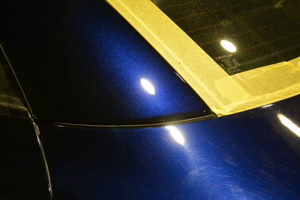 グロスアーマーでご入庫中のレクサス SC。パネルの境目から上が研磨後。下が研磨前です。新車からかなりの年月が経ったお車です。研磨前の部分は、細かな洗車傷も目立ちますが、さらに塗装表面が劣化し白っぽくなっています。それを上のように蘇らせるには、しっかりとした研磨しかありません。まだコーティング前ですが、吸い込まれそうな美しい紺色が蘇ってきています。