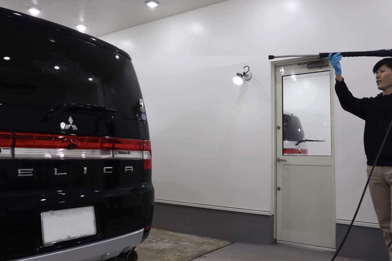奥のブースでは白のデリカD5をオーナー様がセルフ洗車されています。融雪剤などで汚れやすい時期ですが、汚れを固着させないよう、時々洗車してあげることが大切です。融雪剤は「塩」ですので、水で流してあげるだけでも全然違います。車体の下回りも高圧洗浄してあげると錆の予防になります。当店ではシミの原因になる不純物を取り除いた「純水」で高圧洗浄できますので、時間がない時は高圧洗浄だけして、洗車や拭き取りをしなくても大丈夫です。こちらのお客様も15分もかからずに洗車完了されていました。