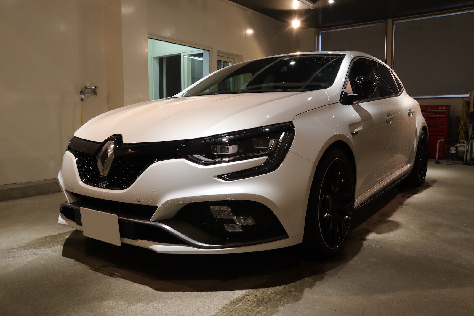 本店です。ルノー メガーヌ R.S. 。軽研磨+グロスアーマー+全面ガラス撥水コーティングのご用命でご入庫いただきました。