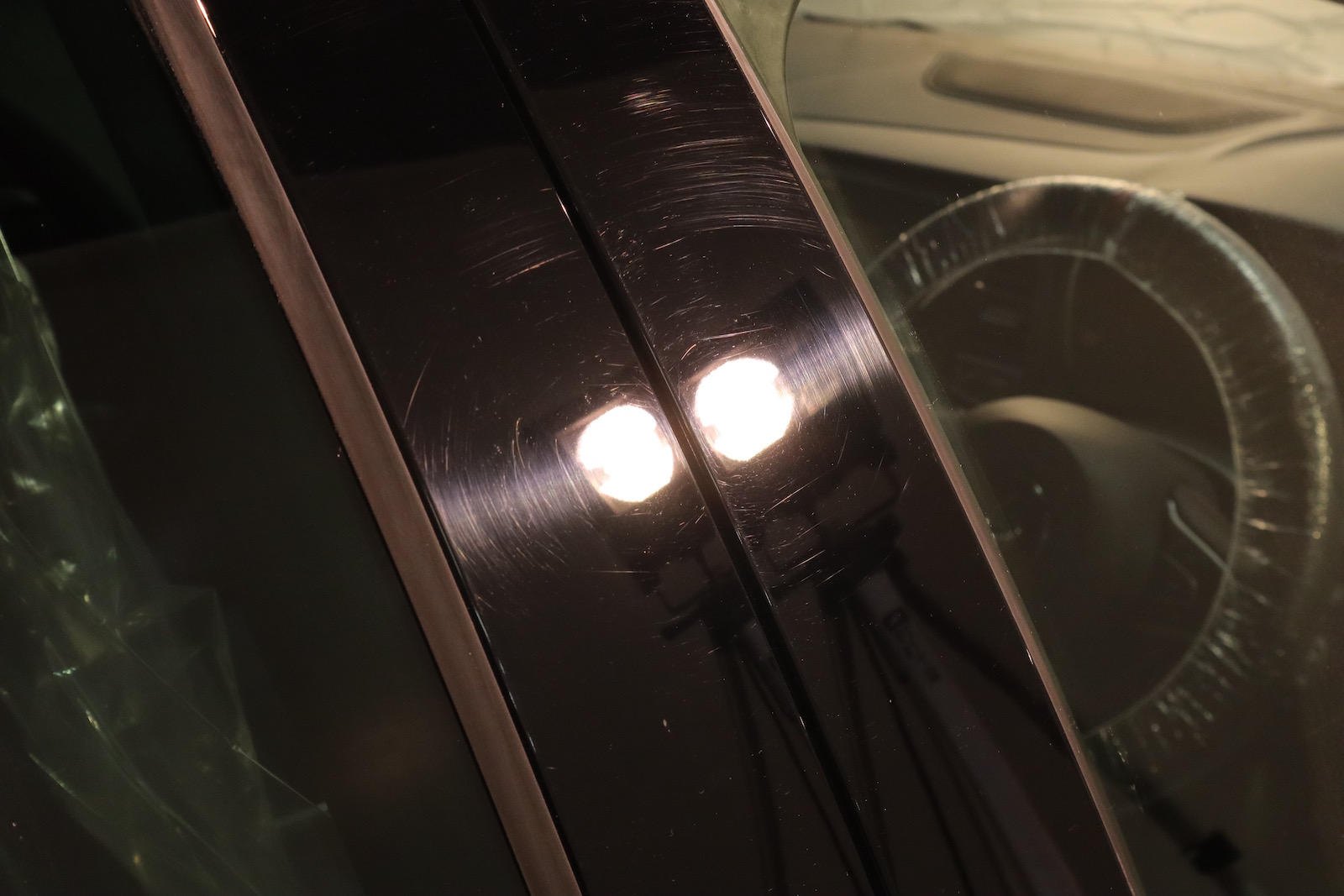 お客様が一番気になさっていたピアノブラック仕上げのドアピラーに付いてしまっていた洗車キズです。黒なので余計に目立ちますね。このように新車でもキズが付いてしまっているおクルマは、残念ながら珍しくありません。