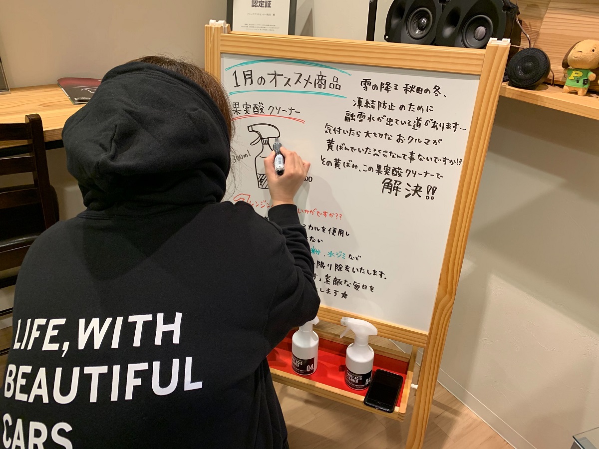 本店の一幕です・・・。上質なカーライフ送っていただくため、店舗のホワイトボードで今月のおすすめ商品をご紹介することにしました!