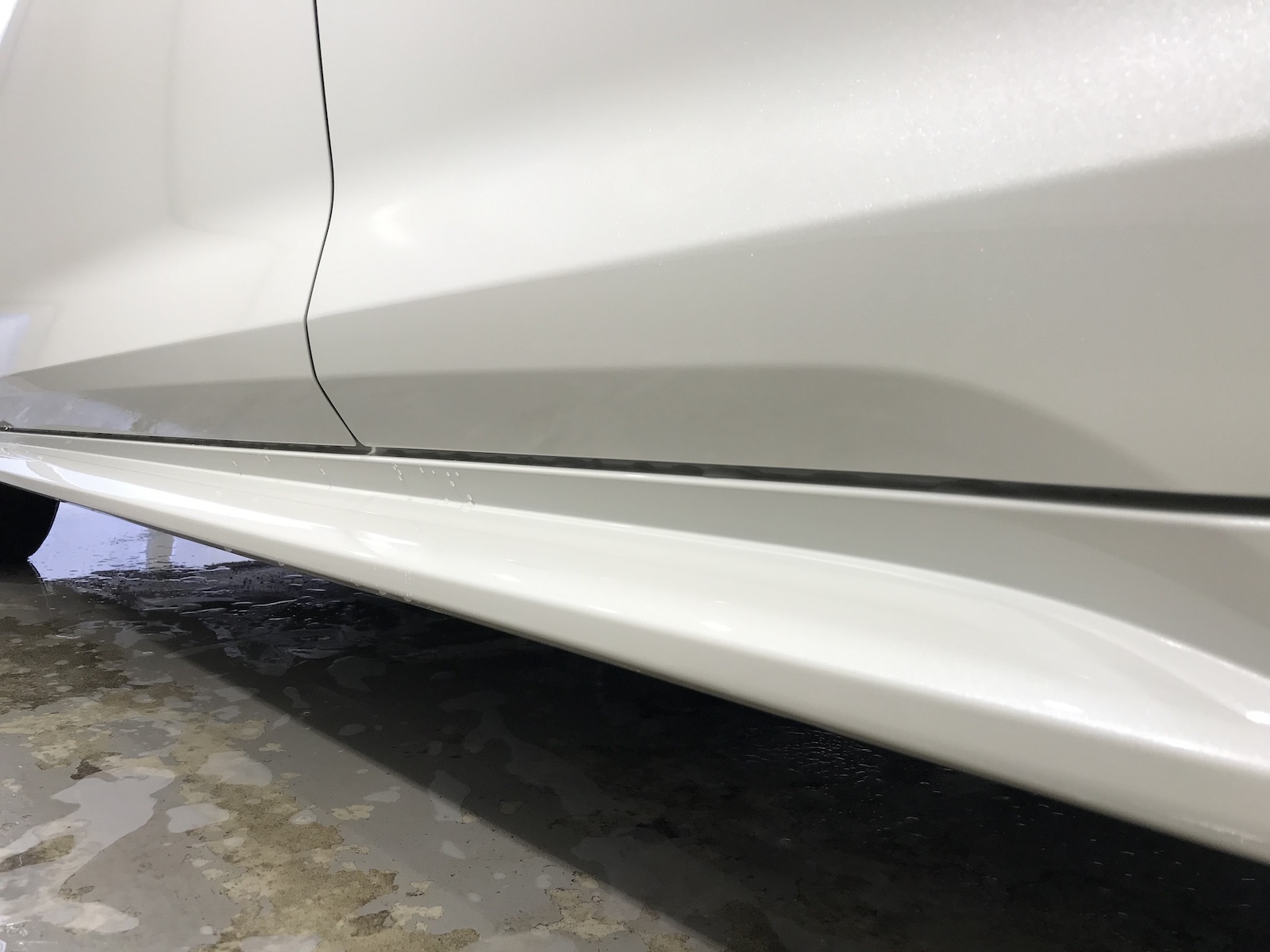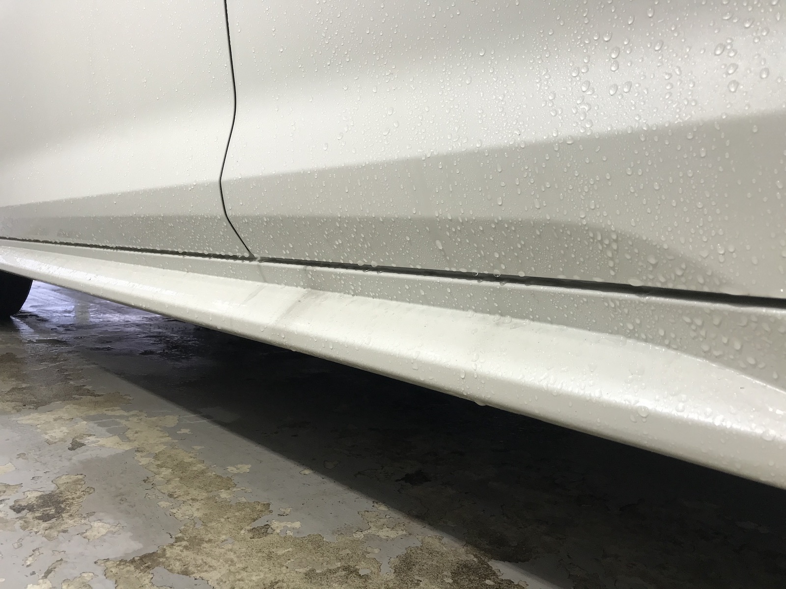 続いてサイドステップの黒く縦じまのように見える汚れです。ドアの中から出てくる油汚れで、車が新しい時に特に良く出てきます。通常ならシャンプー洗車で落ちてしまう汚れですが、イージーグロスコートナノでは仕上げていますが、ベースのガラスコーティングを施工していないせいか少し残ってしまったので、コロイド洗浄剤を使い綺麗にしました。