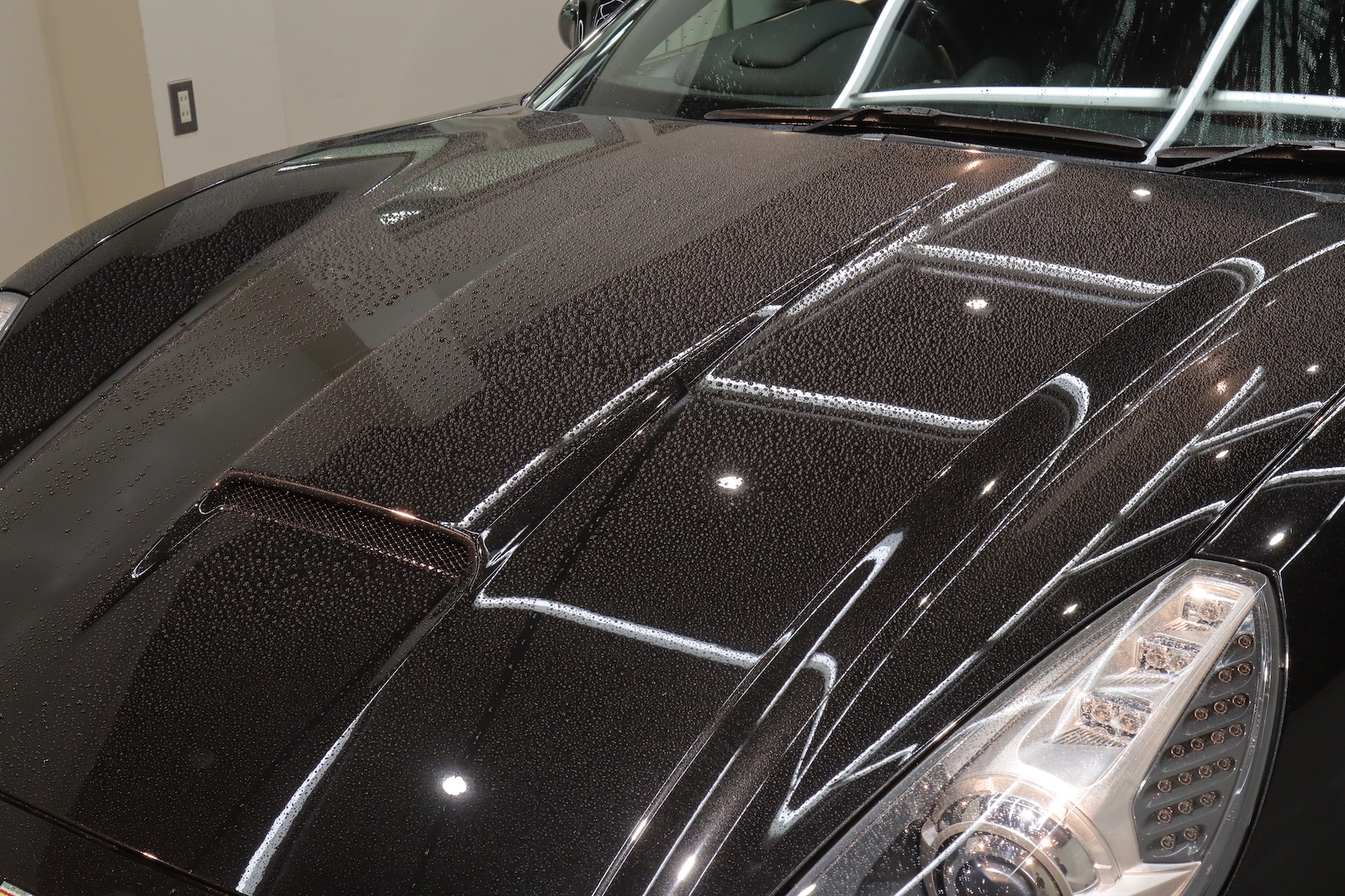 こちらの写真は、ボンネットの撥水を部分的に除去した写真です。手前側の部分が撥水しなくなり水が引いていくようになりました。当店では、このように洗剤で除去できるものは可能な限り洗剤を使い除去してまいります。