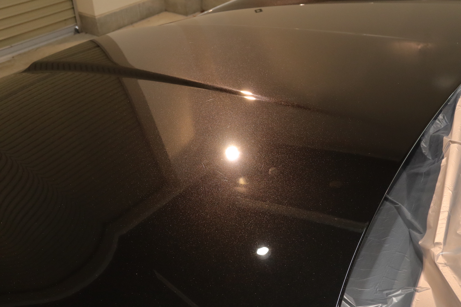 全ての洗浄が終わり研磨作業に移ってまいります。塗装面に写り込んでいるスポットライトのまわりに細かな洗車キズが付いてしまっているのがお分かりになるでしょうか?