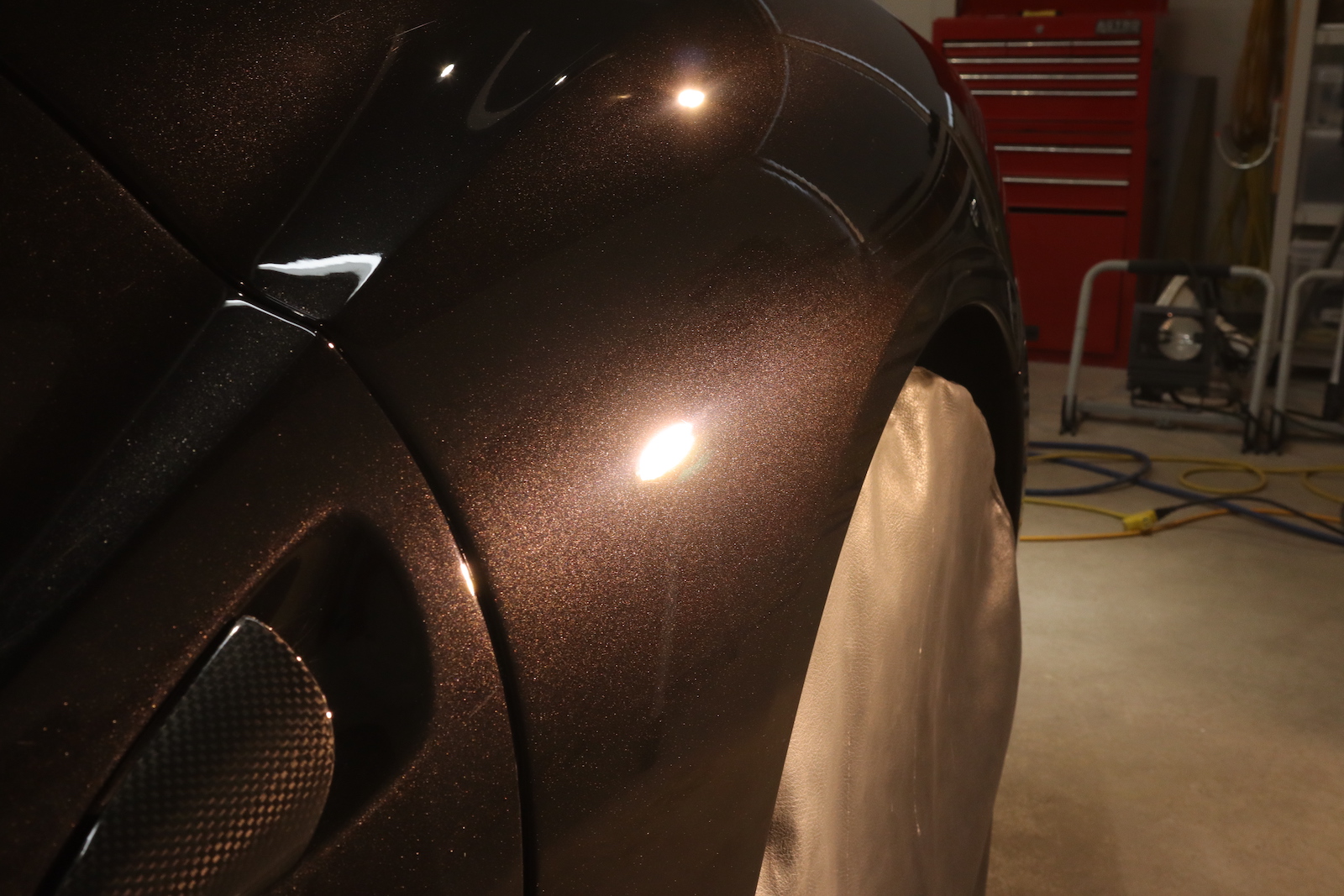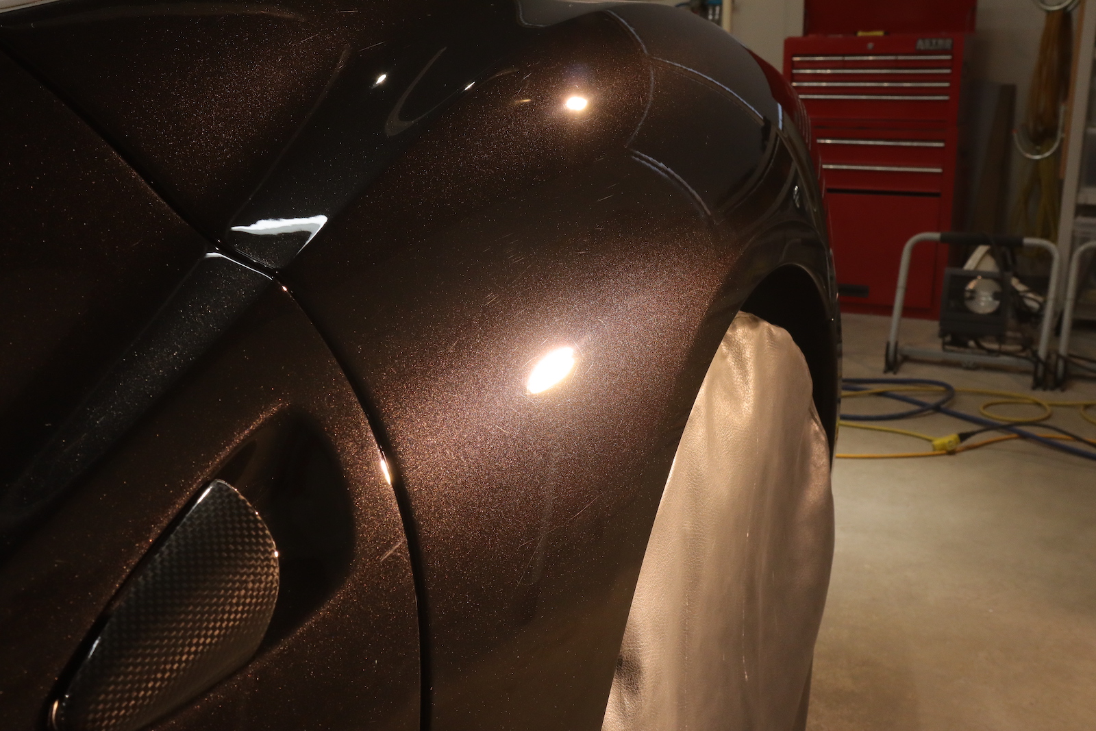 全ての洗浄と研磨作業が完了いたしました。塗装本来の艶も引き出されフェラーリらしくなりました。さらに2層の極艶ビューティフルコートを施工して艶を最大限にしてまいります。