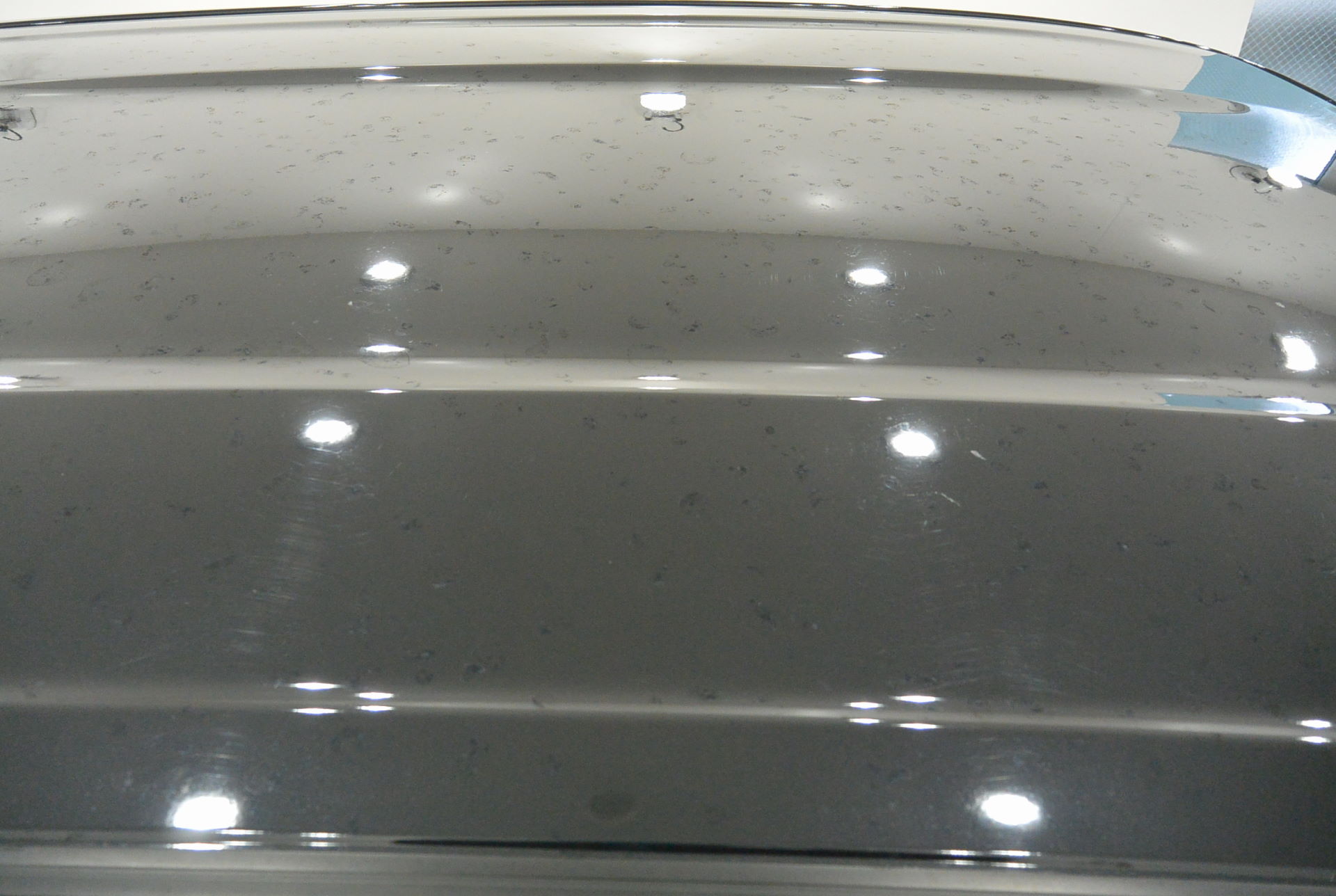 下の写真は、黒いおクルマのルーフに付いた水ジミですが、これは通常の洗車では落ちません。ウォータースポットリムーバーを水ジミと反応させ、溶かして除去いたします。