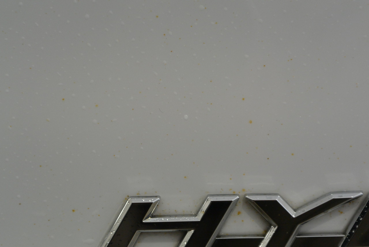 下の写真はリヤドアのエンブレム付近ですが、プツプツと茶色く見える汚れが目立ちます。これは、鉄粉が付着して錆びたものです。こちらもウォータースポットリムーバーを使って、溶かして除去いたします。
