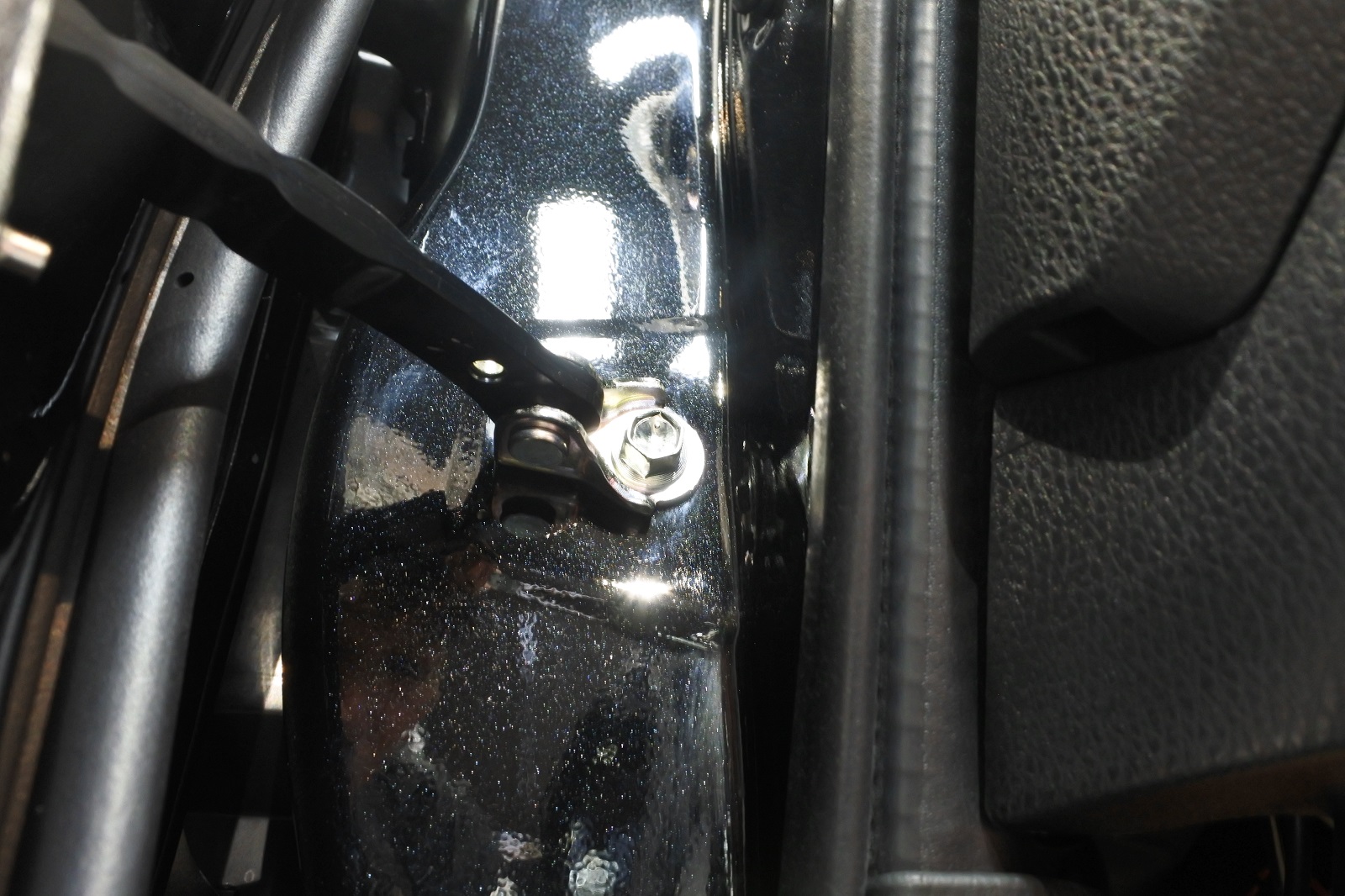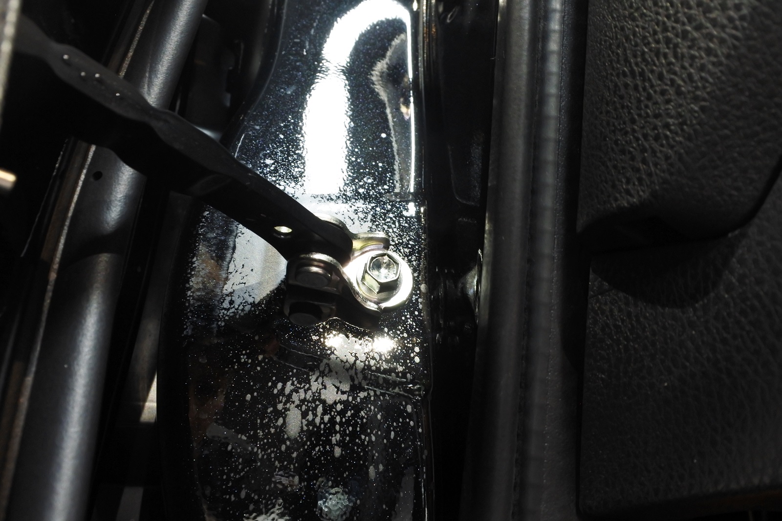 こちらの写真はドアヒンジの裏側の部分になります。錆止めのグリスによる飛び散った油汚れがありました。