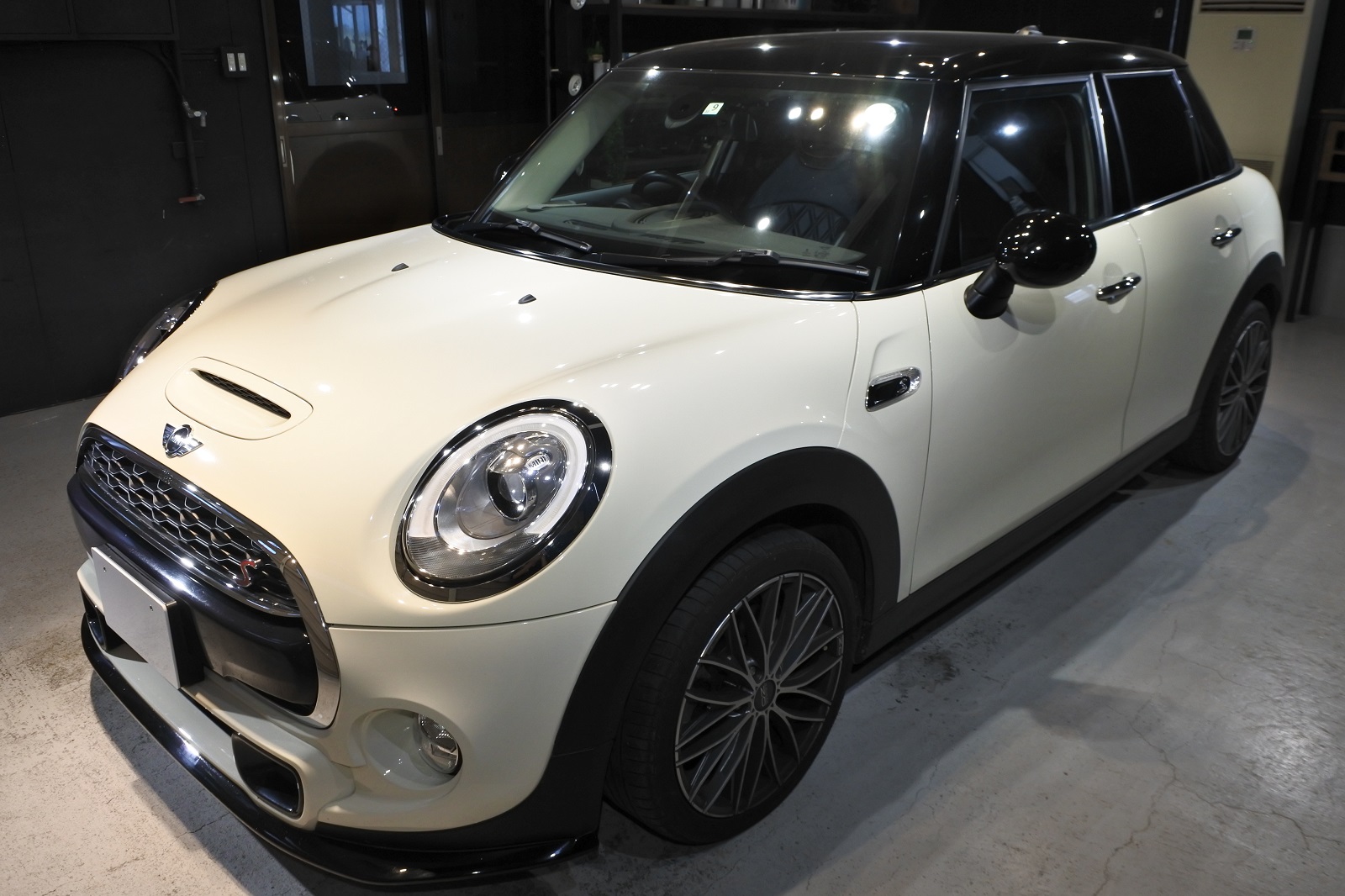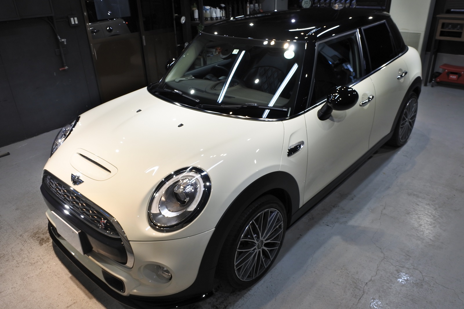 青森・弘前店です。ミニクーパーS 軽研磨+コーティング(グロスアーマー)+全面撥水のご用命でご入庫いただきました。