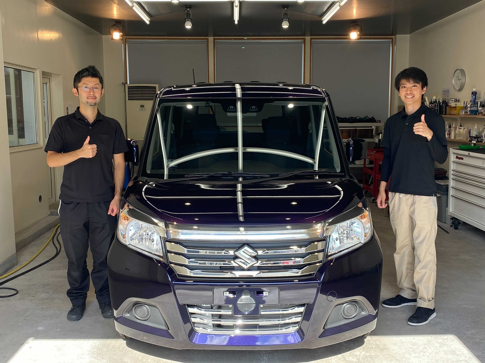 本日、村上塾で受講いただいているお二人が魂を込めて磨きあげた、スズキ ソリオ のグロスアーマー施工が完了いたしました。