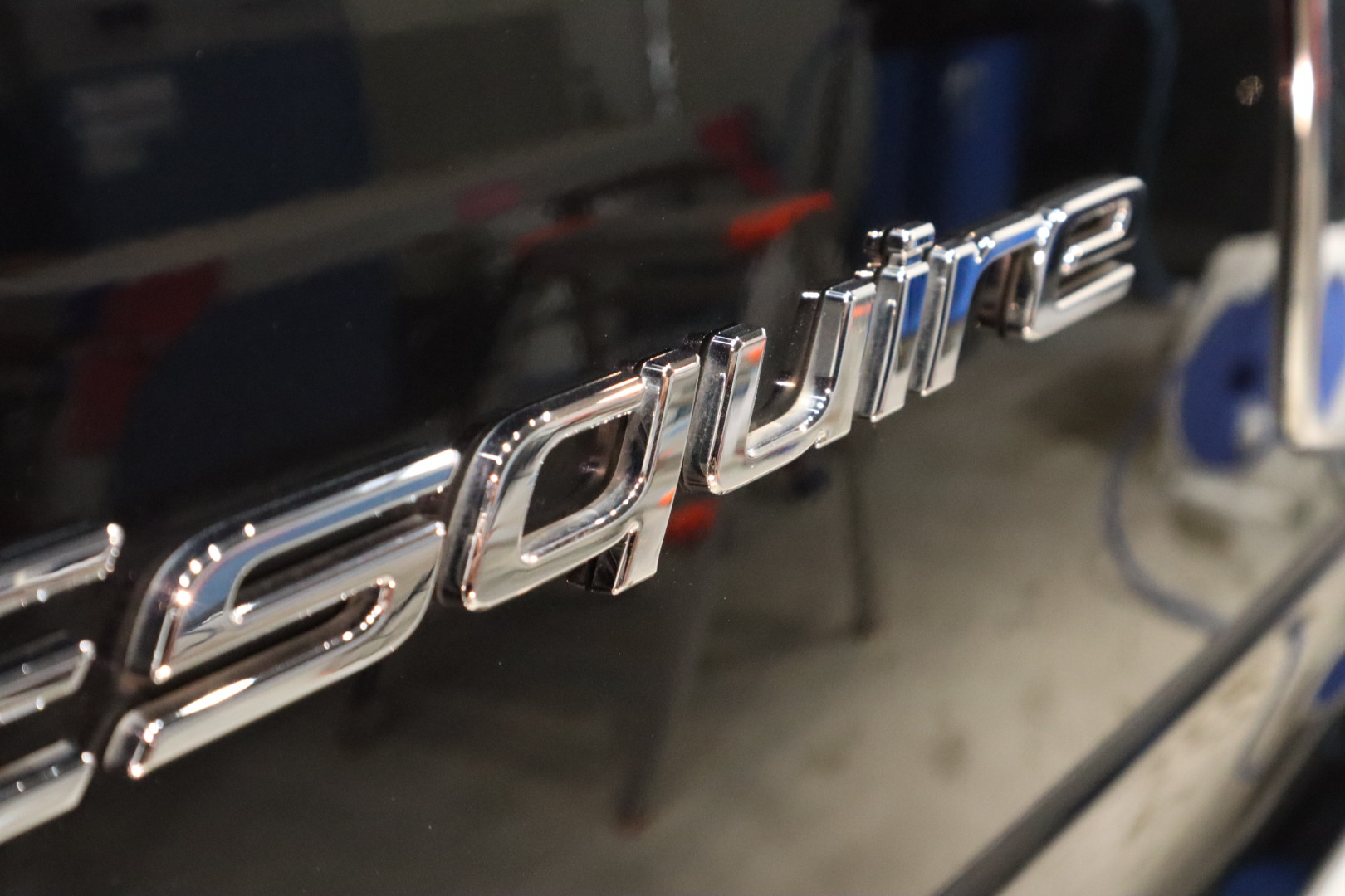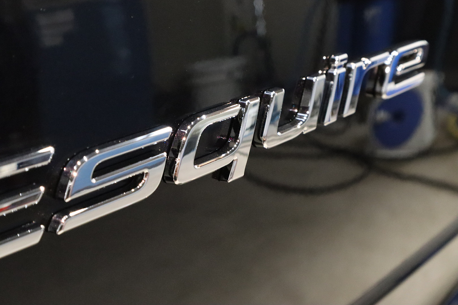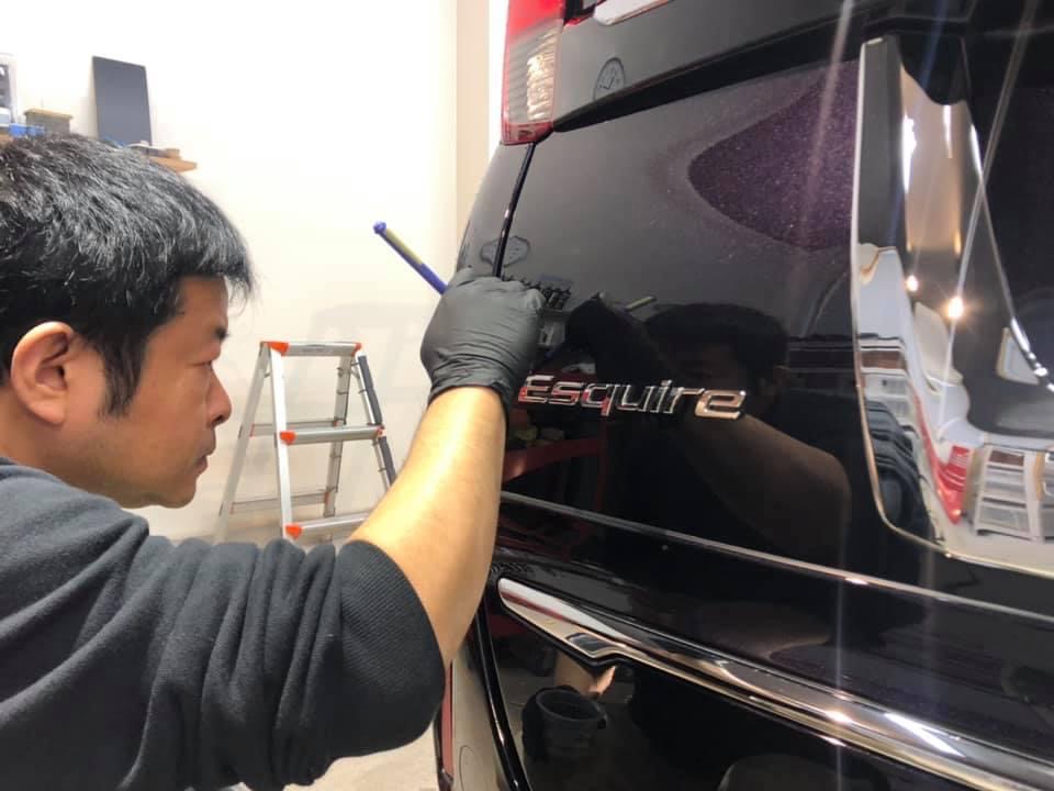下の写真はエスクァイアのエンブレム部分です。文字の内側などには汚れが蓄積しているのが、お分かりいただけるかと思います。この汚れを細部洗浄技術で美しさを取り戻します。