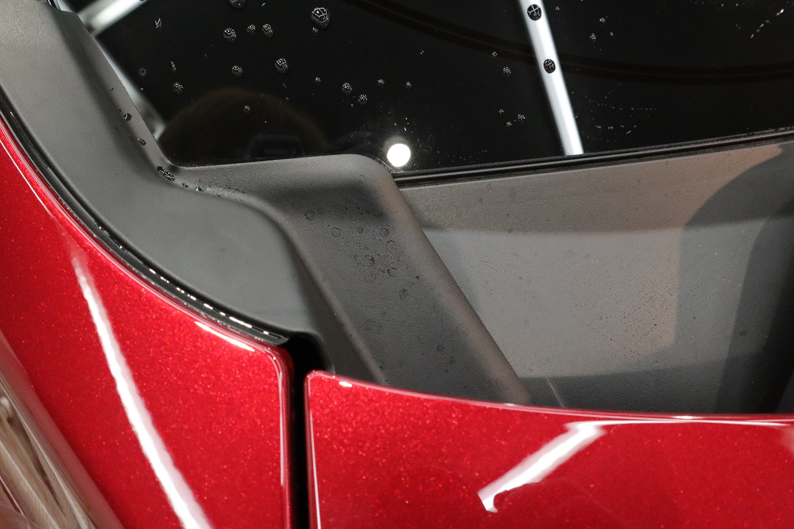 こちらは、カウルトップと呼ばれるフロントガラスとボンネットの間にある樹脂パーツです。水ジミが付着しておりましたので除去してまいります。