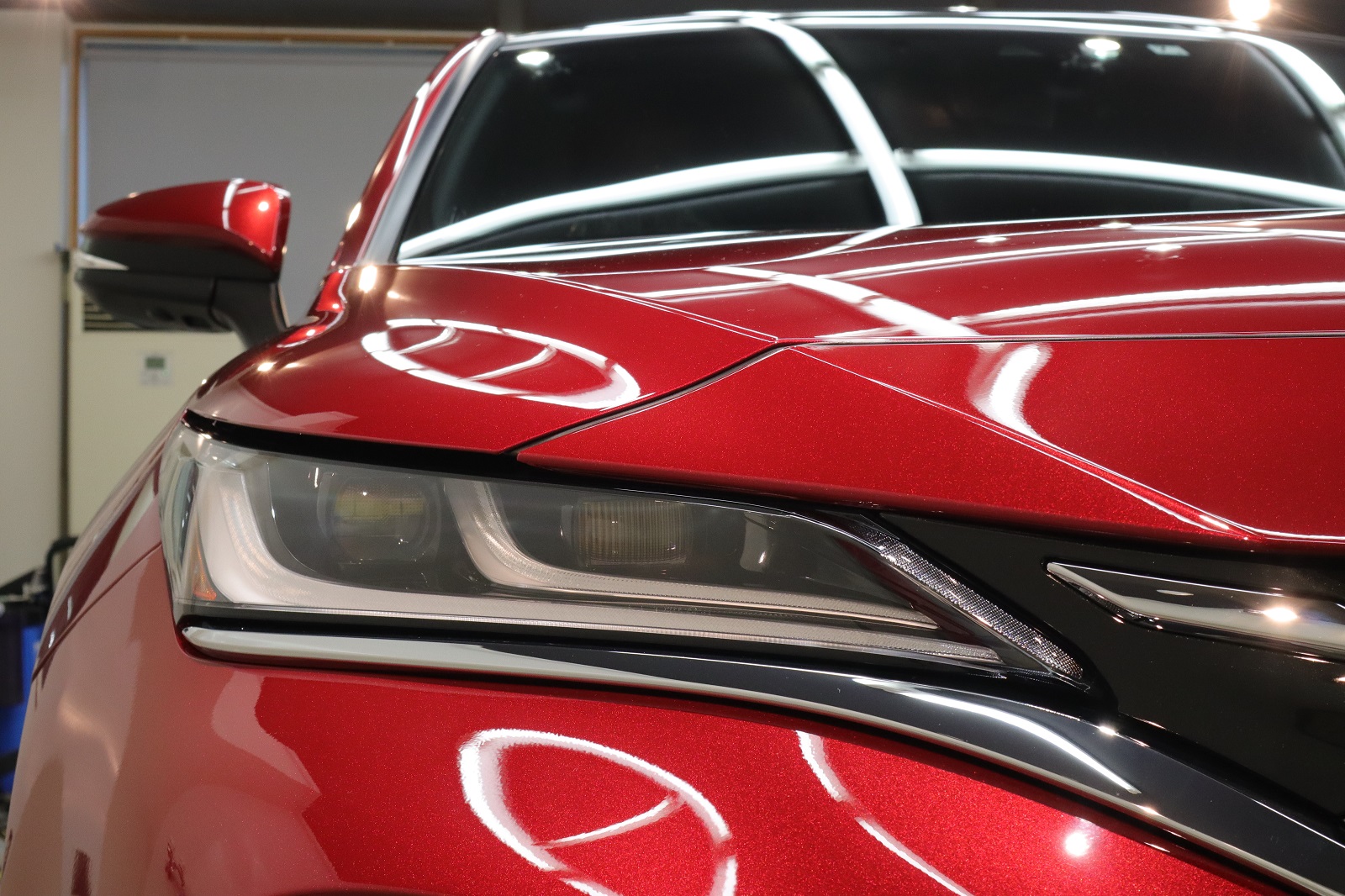 全ての洗浄が終わり、いよいよ研磨作業に移ってまいります。新車ですので元々キレイな塗装面ですが、新車特有の「もやり」がございます。「もやり」とは、こちらの塗装面に写り込んでいるスポットライトが、ぼんやりと写り込んでしまうものです。新車でも磨き上げることで塗装本来の美しさを引き出し、新車を超える美しさとなります。
