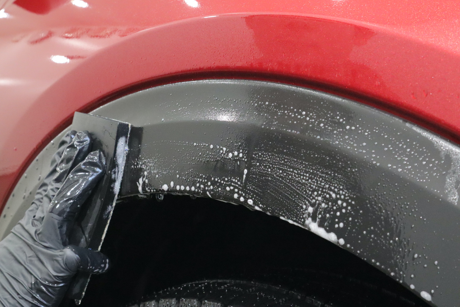 全ての洗浄が終わり、2層の極艶ビューティフルコートを施工してまいります。極艶ビューティフルコートは、キレイな新車に向いておりまして1日で施工ができる完全硬化型のガラスコーティングとなっております。施工後のメンテナンス性にも優れており、普段の洗車で落とすことのできない汚れを除去する際に使用する、強い洗剤にも耐えることができますので長くキレイな状態を保つことができます。