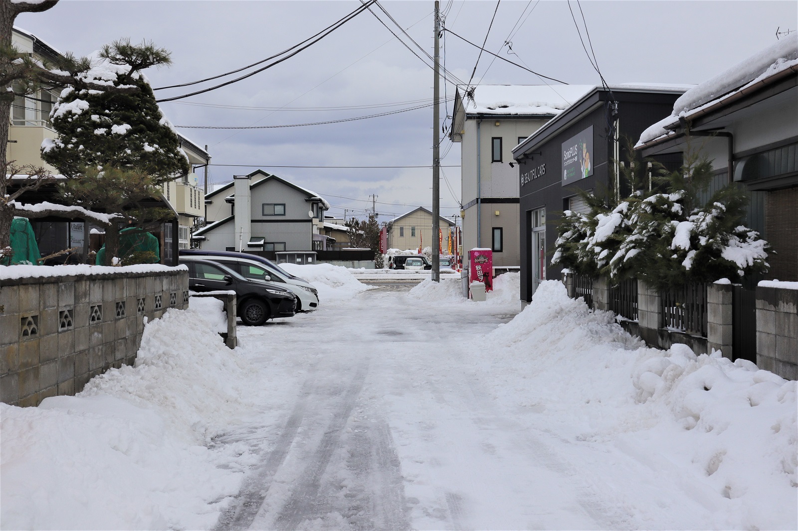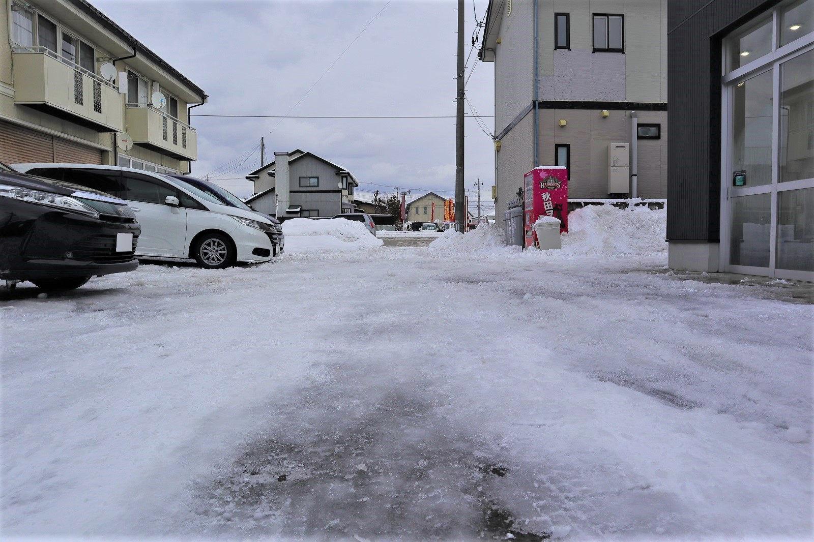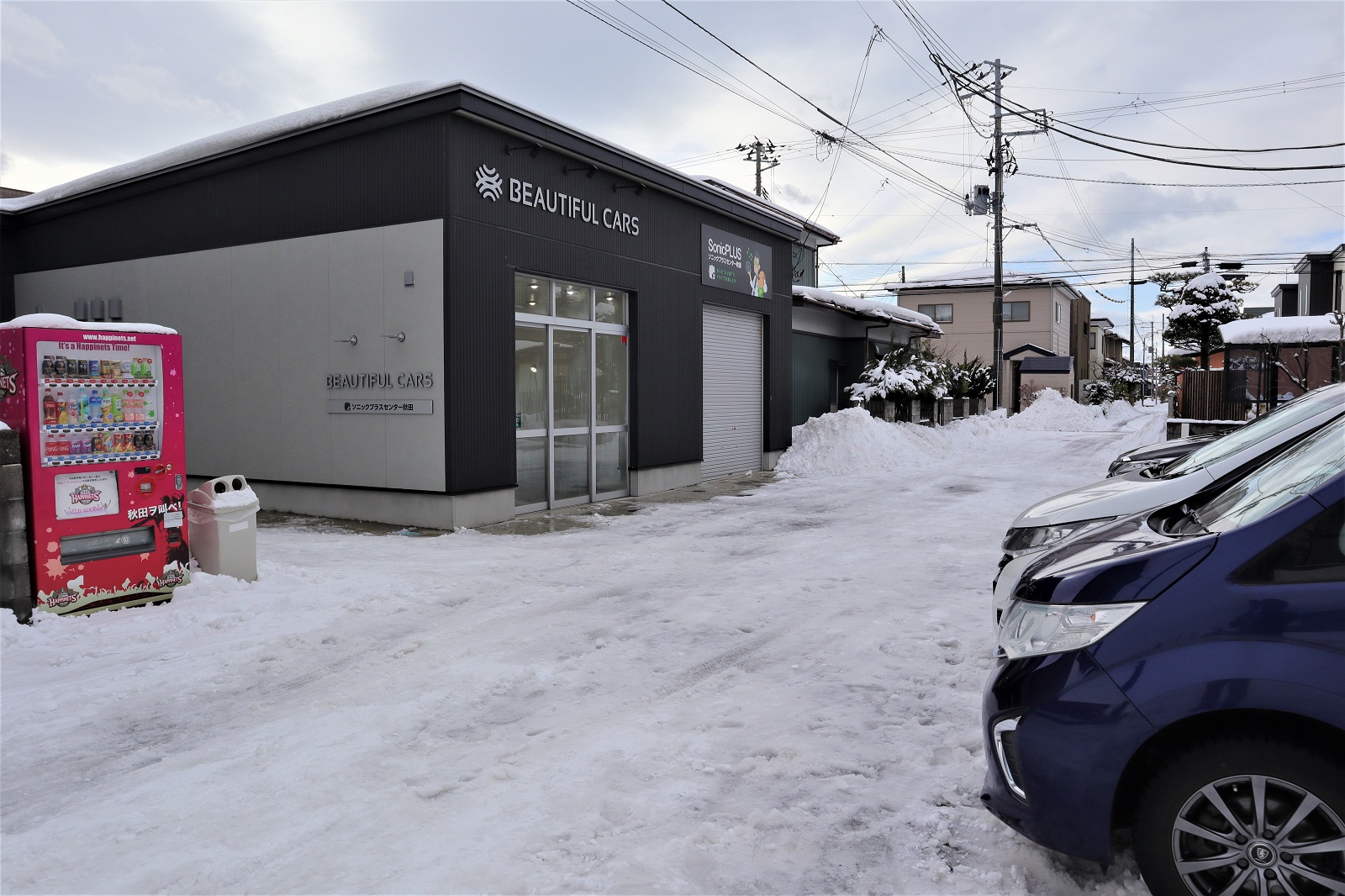 本店です。1月17日(日)に秋田市は10センチ以上の降雪がございました。数日前にも記録的大雪があり、秋田市は溶けては降っての繰り返しとなっています。雪が積もった際は出勤しているスタッフ総出で店舗前を雪よせし、来店しやすい環境を作っております。