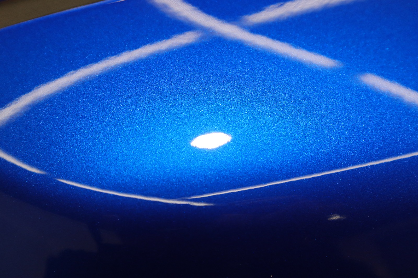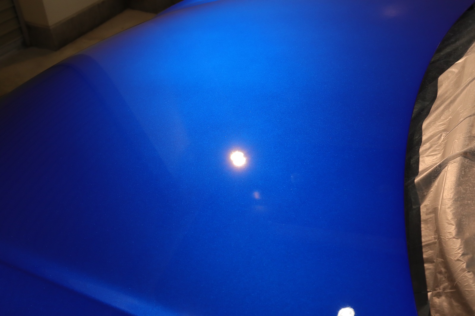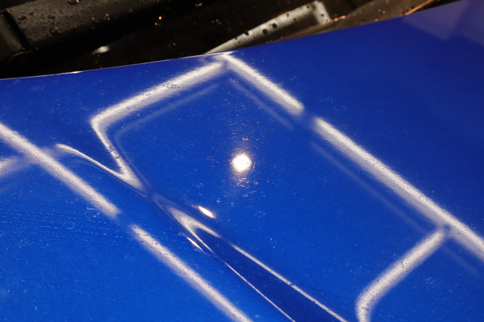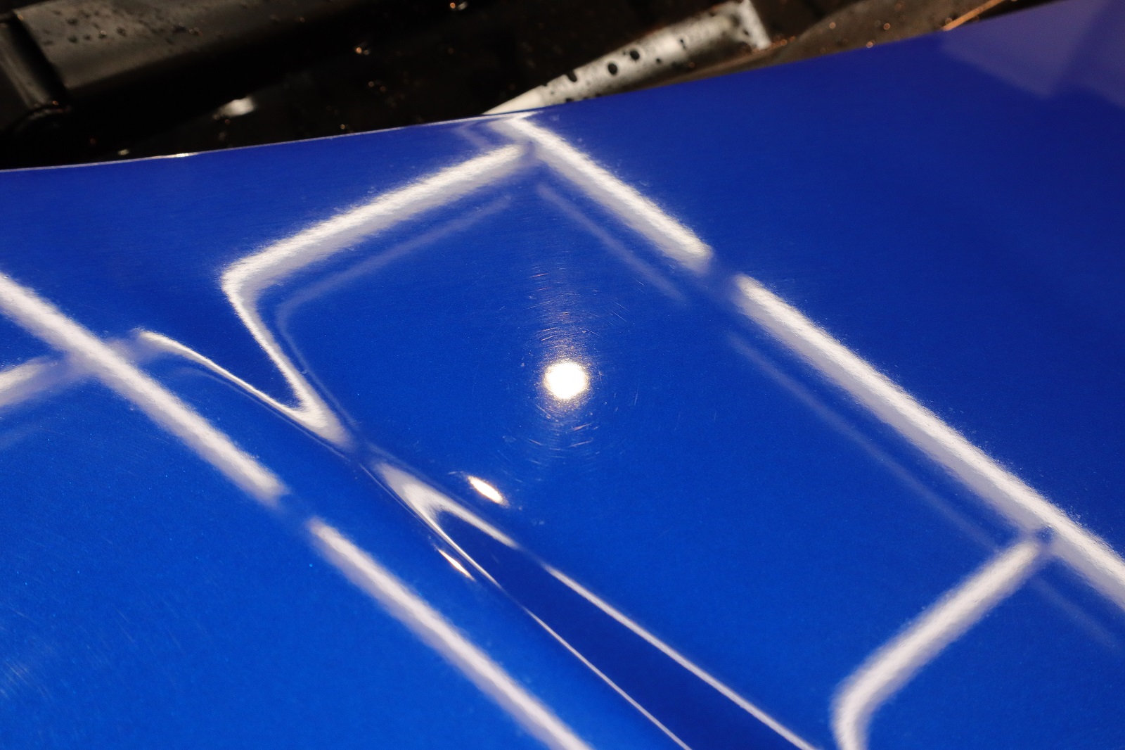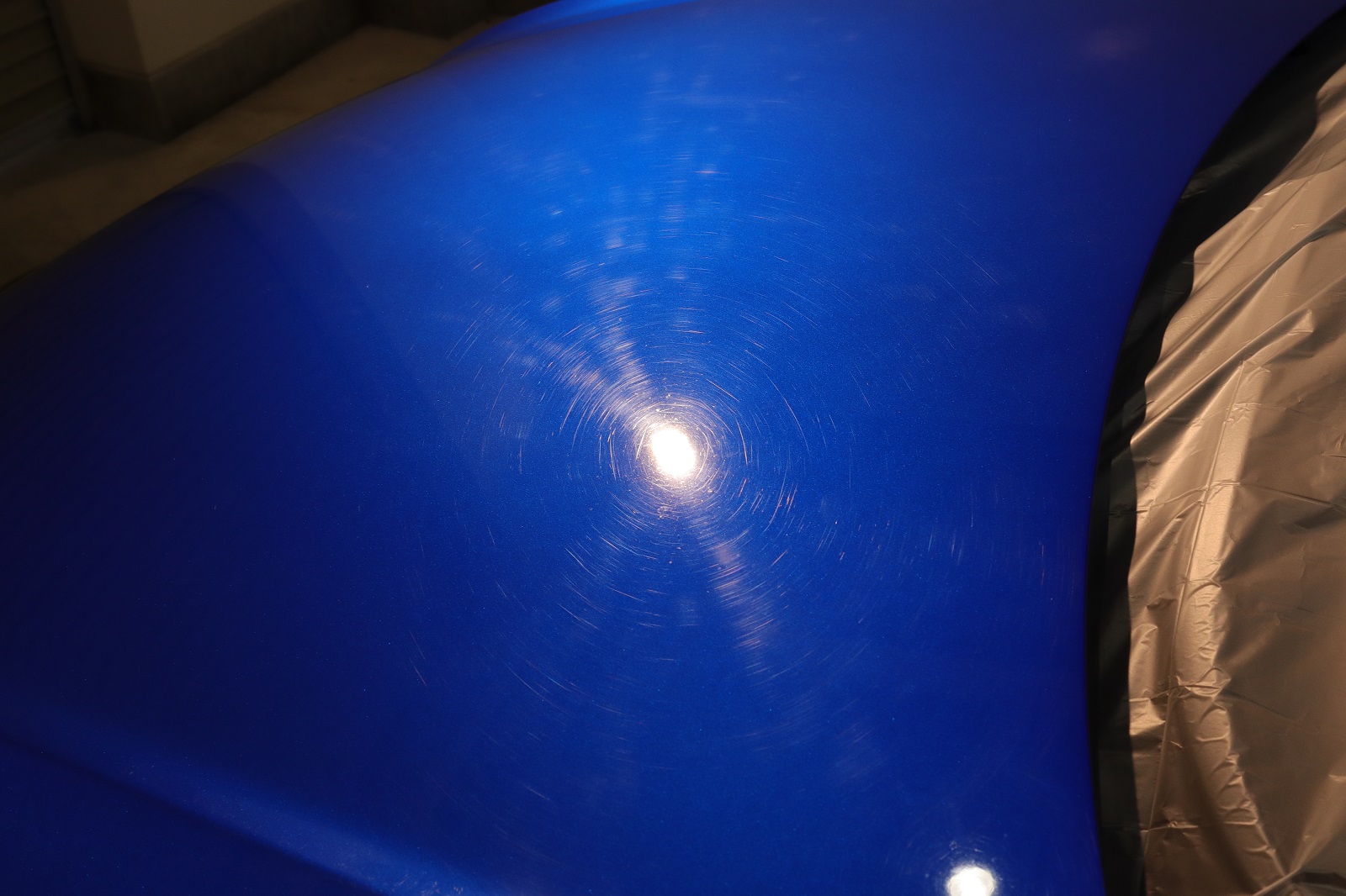 全ての洗浄が終わり、続いて研磨作業に移ってまいります。ボンネットには洗浄しきれなかった水ジミや洗車キズがございました。こちらを美しく磨き上げてまいります。
