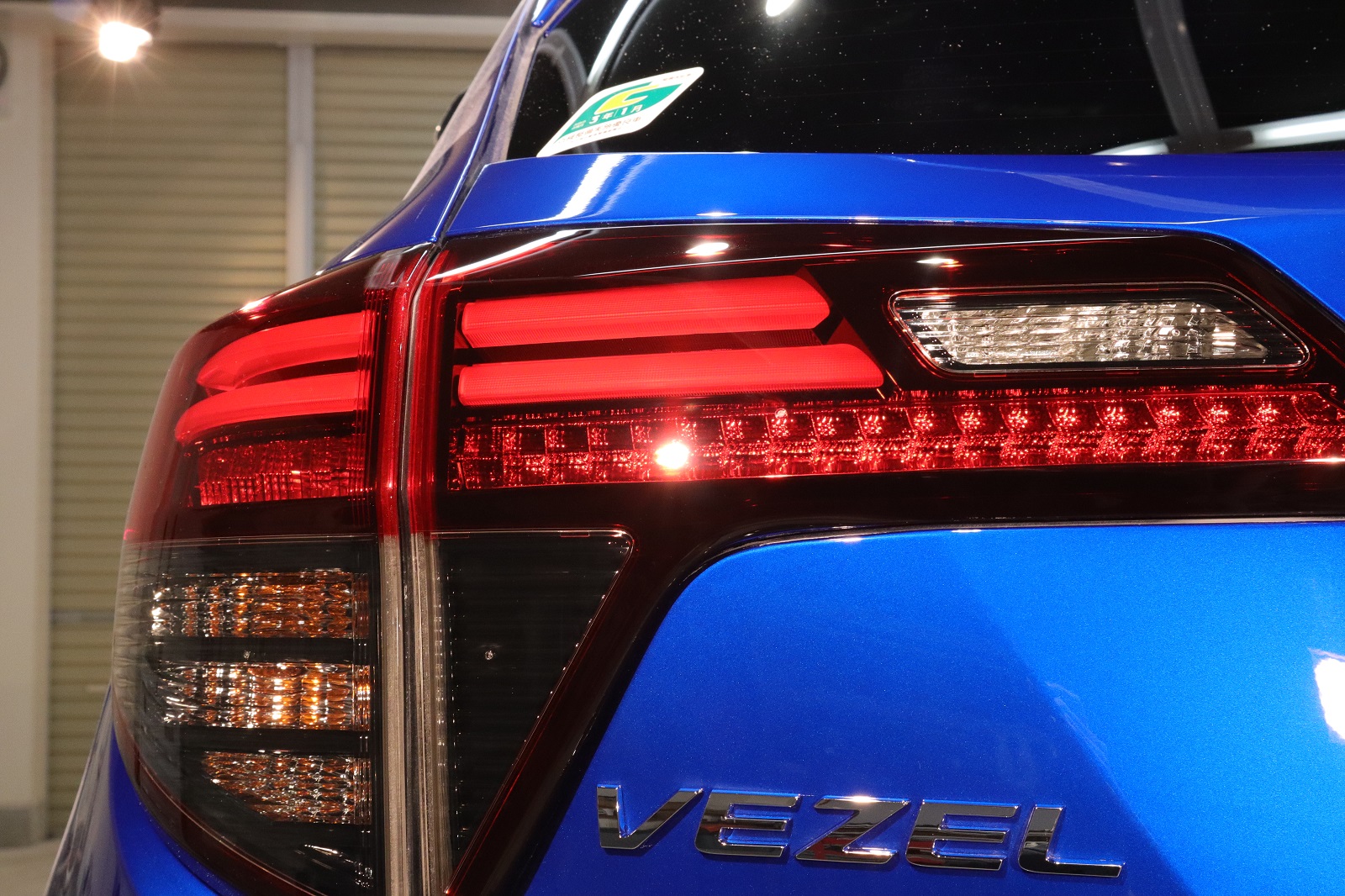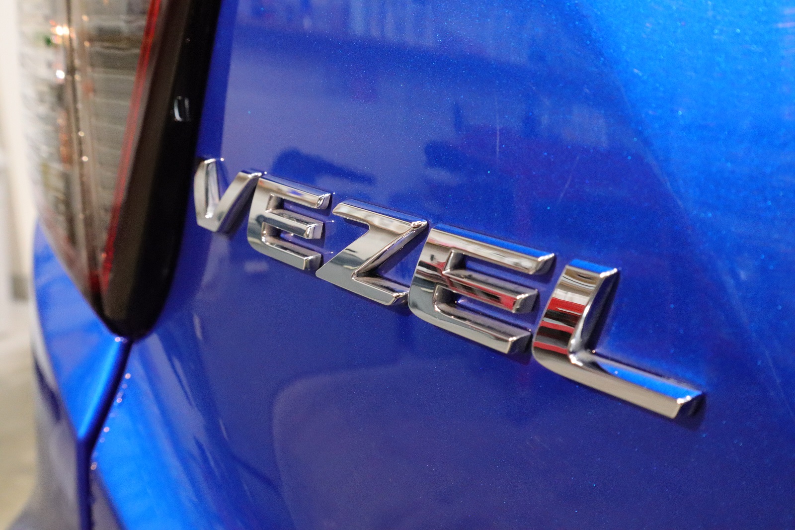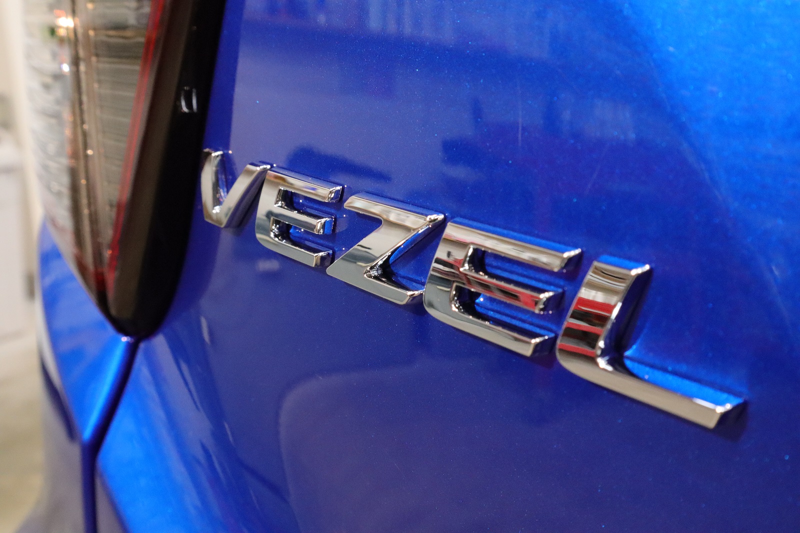続いて細部洗浄に移ってまいります。エンブレムはこのように汚れが溜まりやすくなっております。写真にあるようにVEZELの文字の中に白く汚れが溜まっているのがお分かりになるかと思います。このような細部をキレイにすることで、仕上がったときの全体の印象が変わってきますので、キレイにしていきます。
