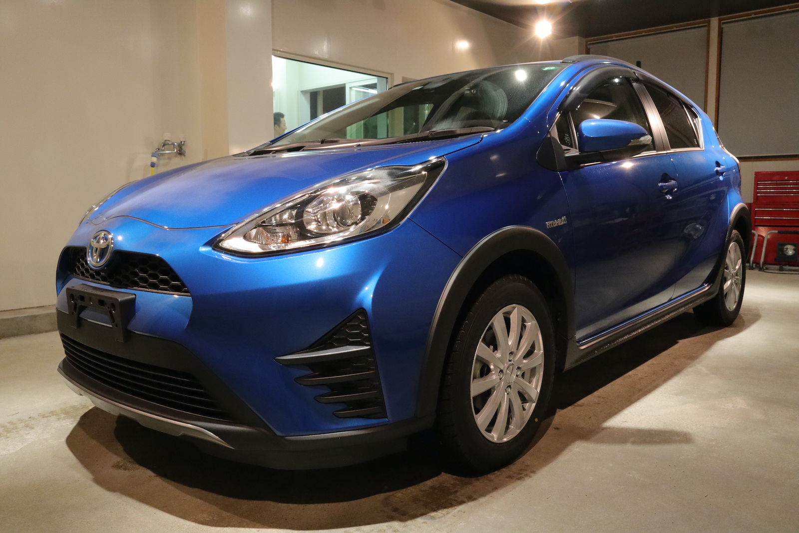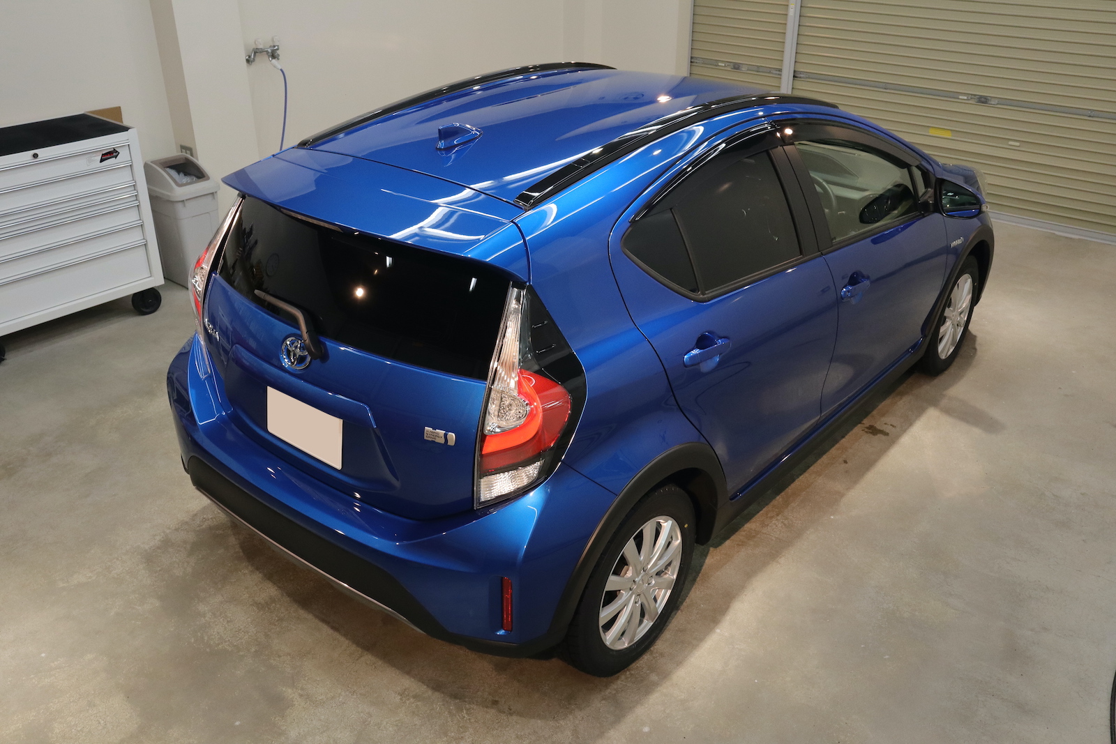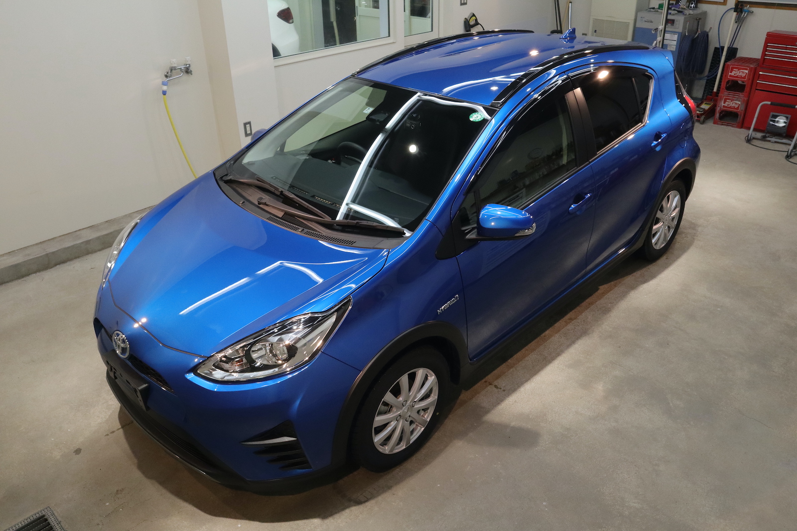 本店です。トヨタ アクア スタンダード研磨+グロスアーマー+全面ガラス撥水のご用命でご入庫いただきました。